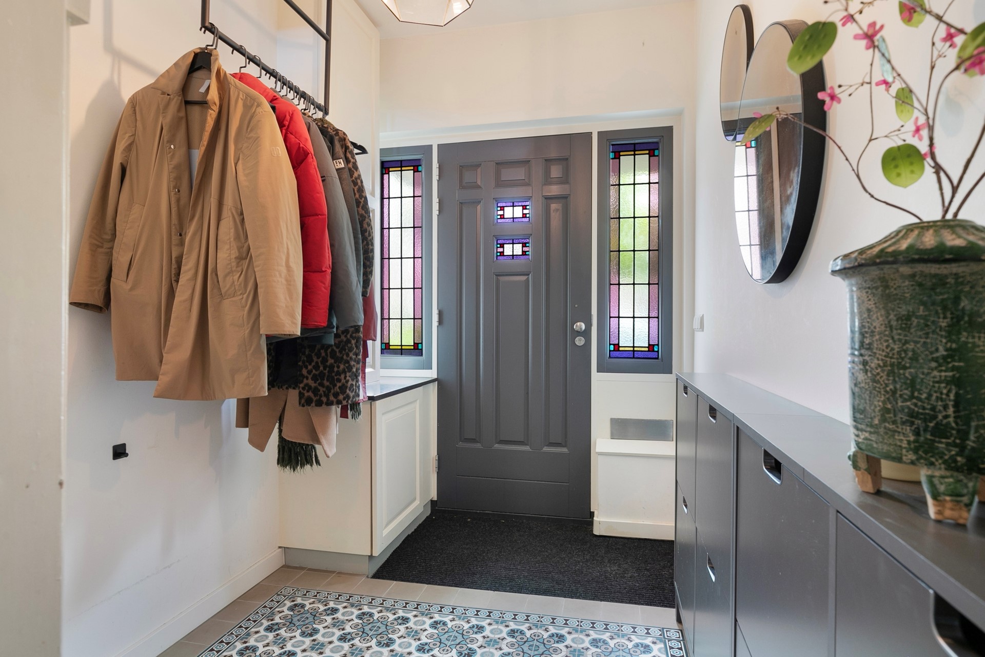Bij binnenkomst word je verwelkomd door de mooie jaren '30 stijl voordeur, met ernaast glas-in-loodramen die zorgen voor een prachtige lichtinval en voor privacy. Vóór de glas-in-lood ramen is dubbelglas geplaatst voor optimale isolatie.