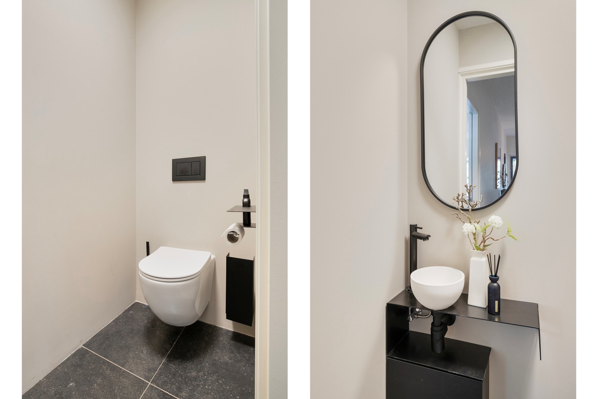 De toiletruimte - eveneens toegankelijk vanuit de hal - is ingericht met een zwevend toilet en een fonteintje. Dit kleinste kamertje heeft een modern design en een hoogwaardige afwerking.