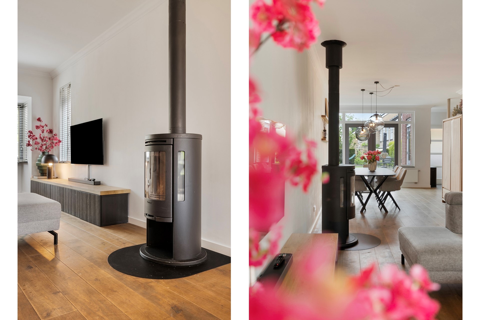 De woonkamer straalt een warme en een uitnodigende sfeer uit, heerlijk voor ontspanning en gezelligheid. Grote ramen en een karakteristieke erker zorgen voor een overvloed aan natuurlijk licht, terwijl de houtkachel een knusse sfeer geeft op koude winteravonden.