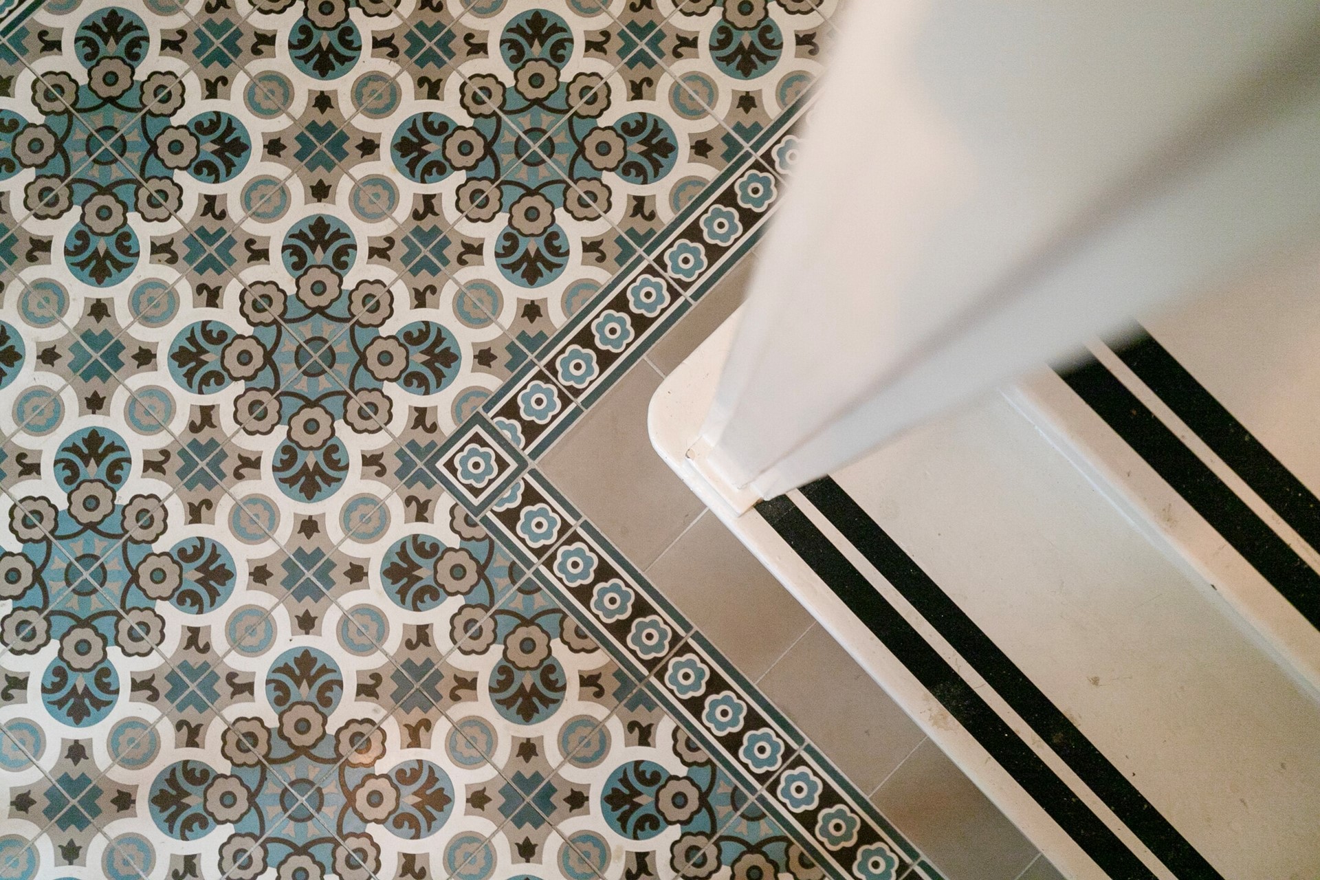 De hal is een ware eyecatcher, waar de nieuwe maar karakteristieke tegels op de vloer direct de aandacht trekken en zorgen voor een perfecte balans tussen authentiek en modern.