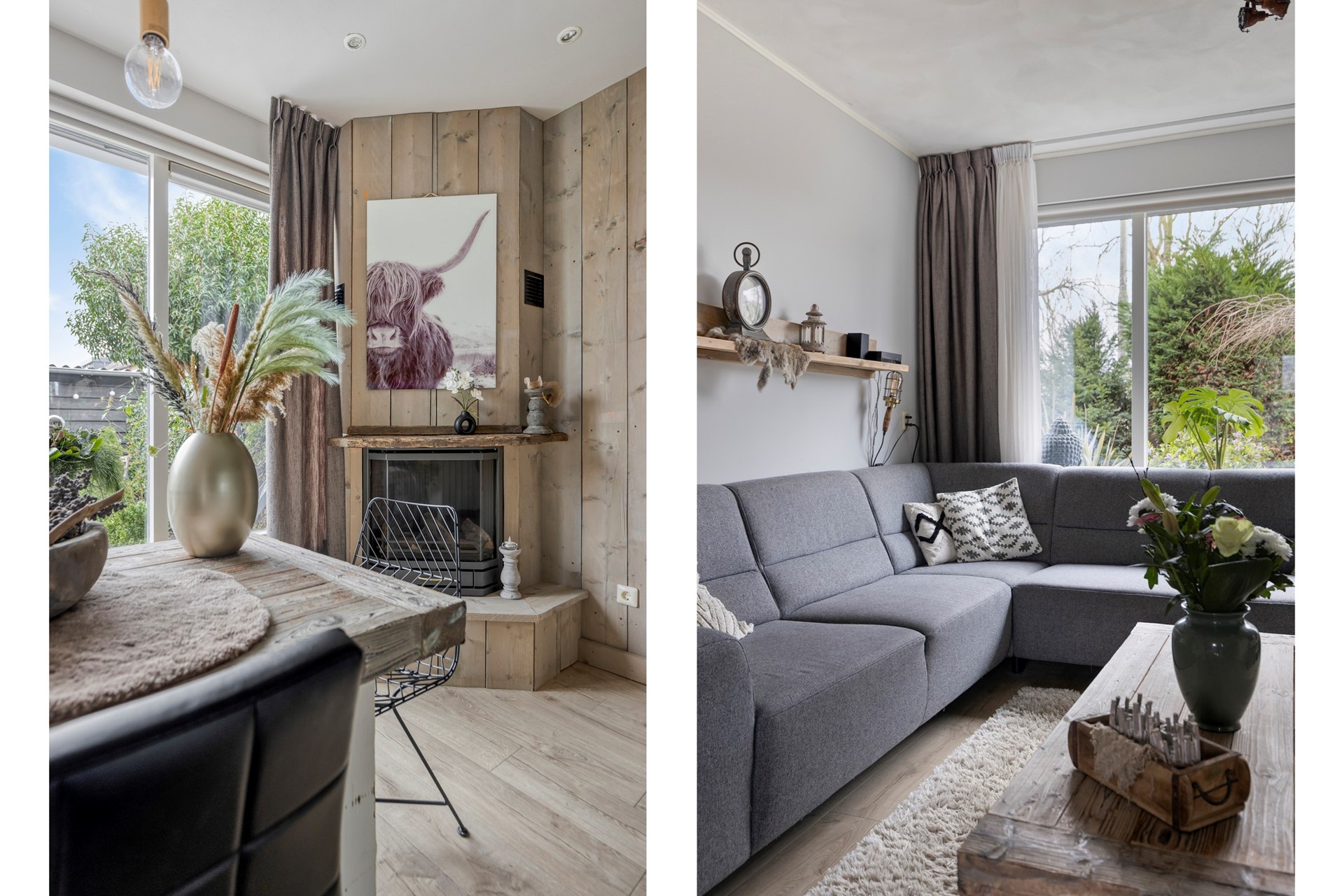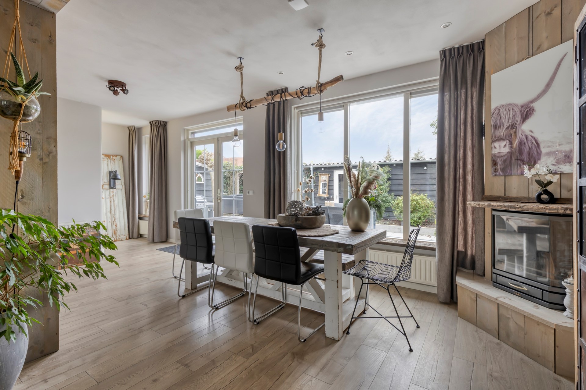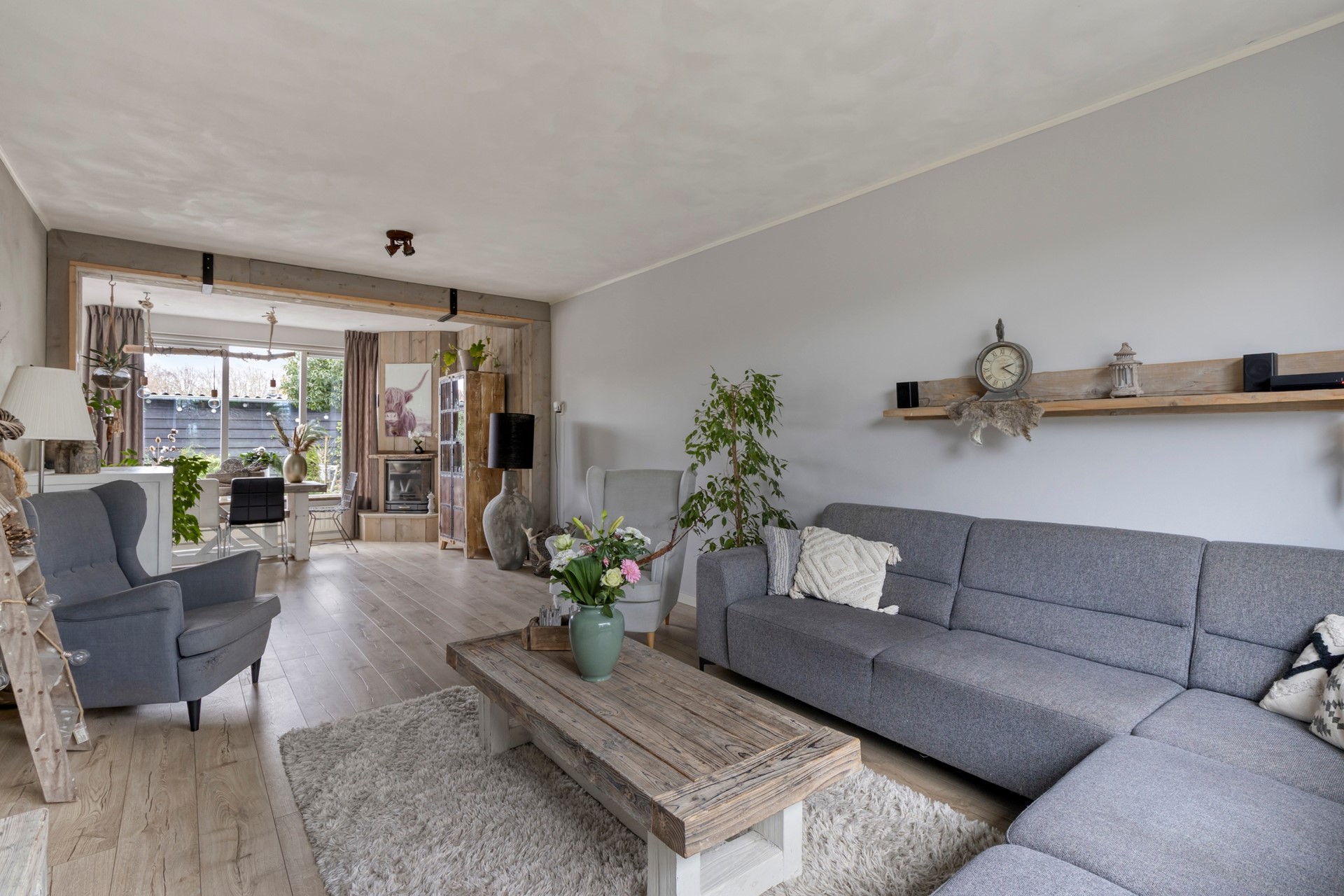 De woonkamer is licht en sfeervol, met een laminaatvloer en strak afgewerkte stucwanden en -plafond. Aan de achterzijde is het huis uitgebouwd, waardoor er volop ruimte is voor een grote, gezellige eettafel. Perfect voor lange diners, spelletjesavonden of gewoon een goede kop koffie in de ochtend.