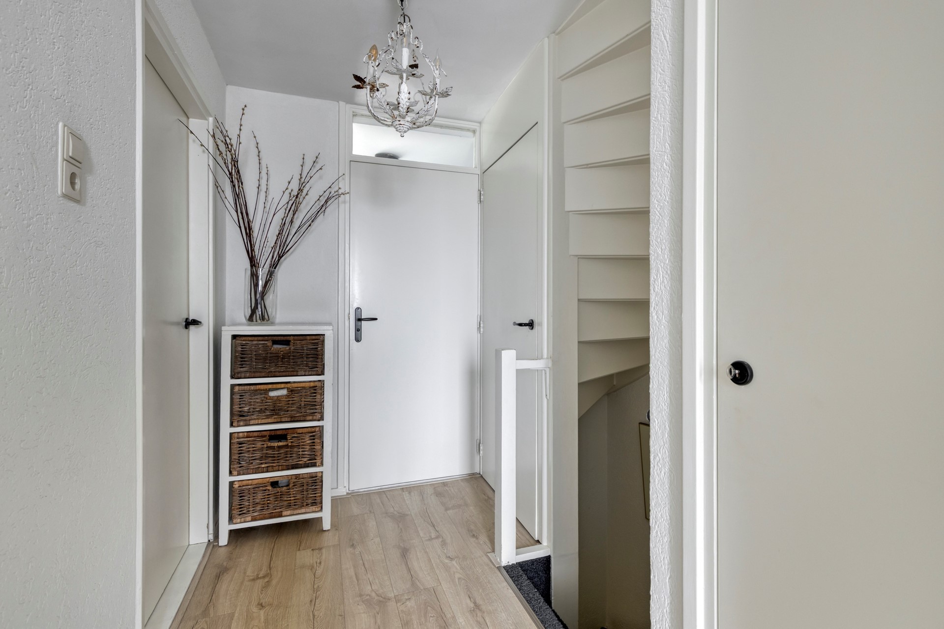 Je komt binnen in de hal, waar je toegang hebt tot de toiletruimte en de woonkamer. In de hal is ook de trap naar de eerste verdieping, een handige trapkast en de meterkast – alles netjes uit het zicht.