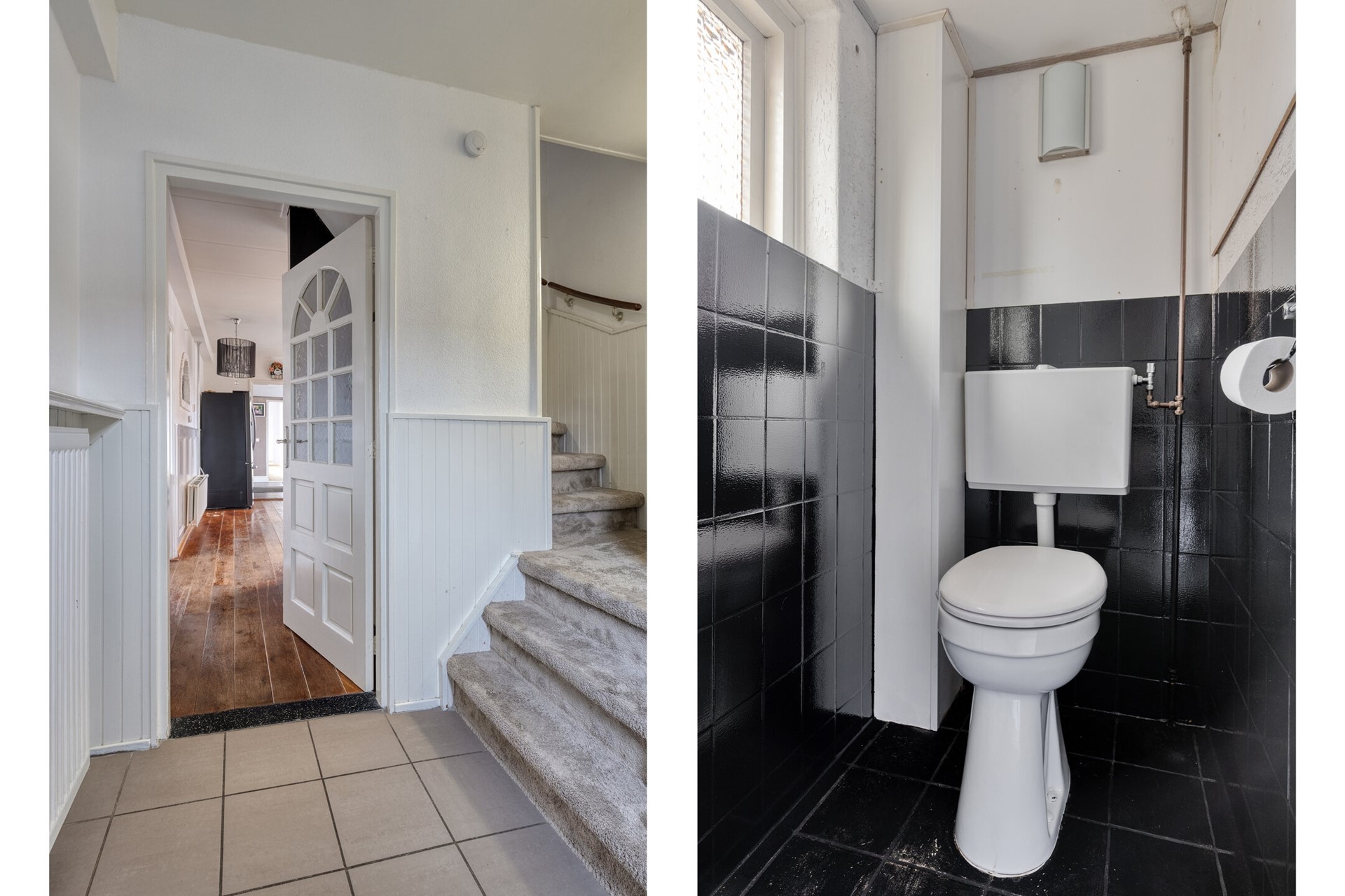 Hal met meterkast (8 groepen en 2 aardlekschakelaars). De toiletruimte is een paar treden hoger en heeft een staand toilet.