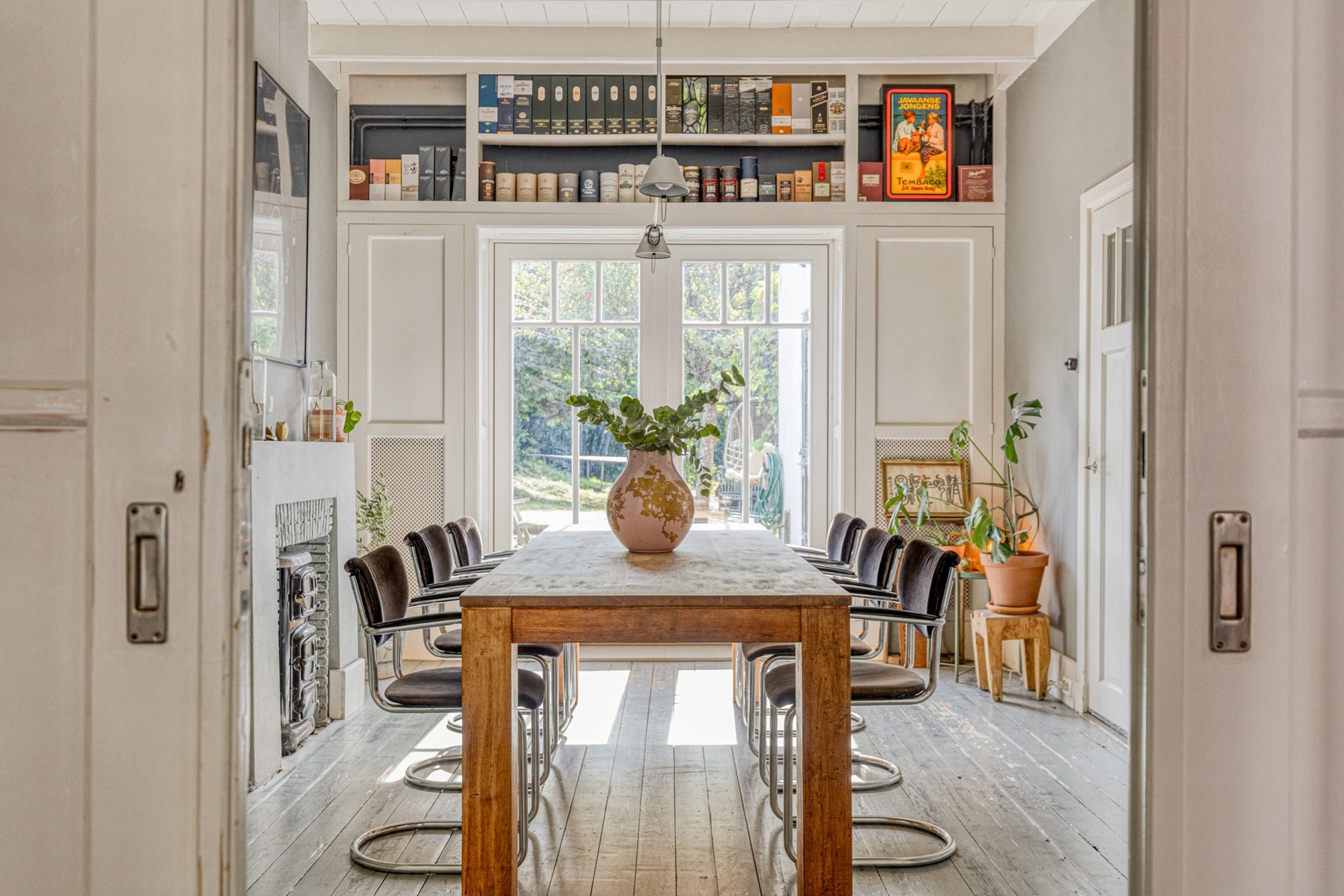 De woonkamer is een echte eyecatcher, met een houten vloer, hoge houten plafonds en een klassieke kamer en suite-indeling. De voor- en achterkamer kunnen worden gescheiden door schuifdeuren met vaste kasten. De open haard in de schouw in de voorkamer zorgt voor extra warmte en gezelligheid.