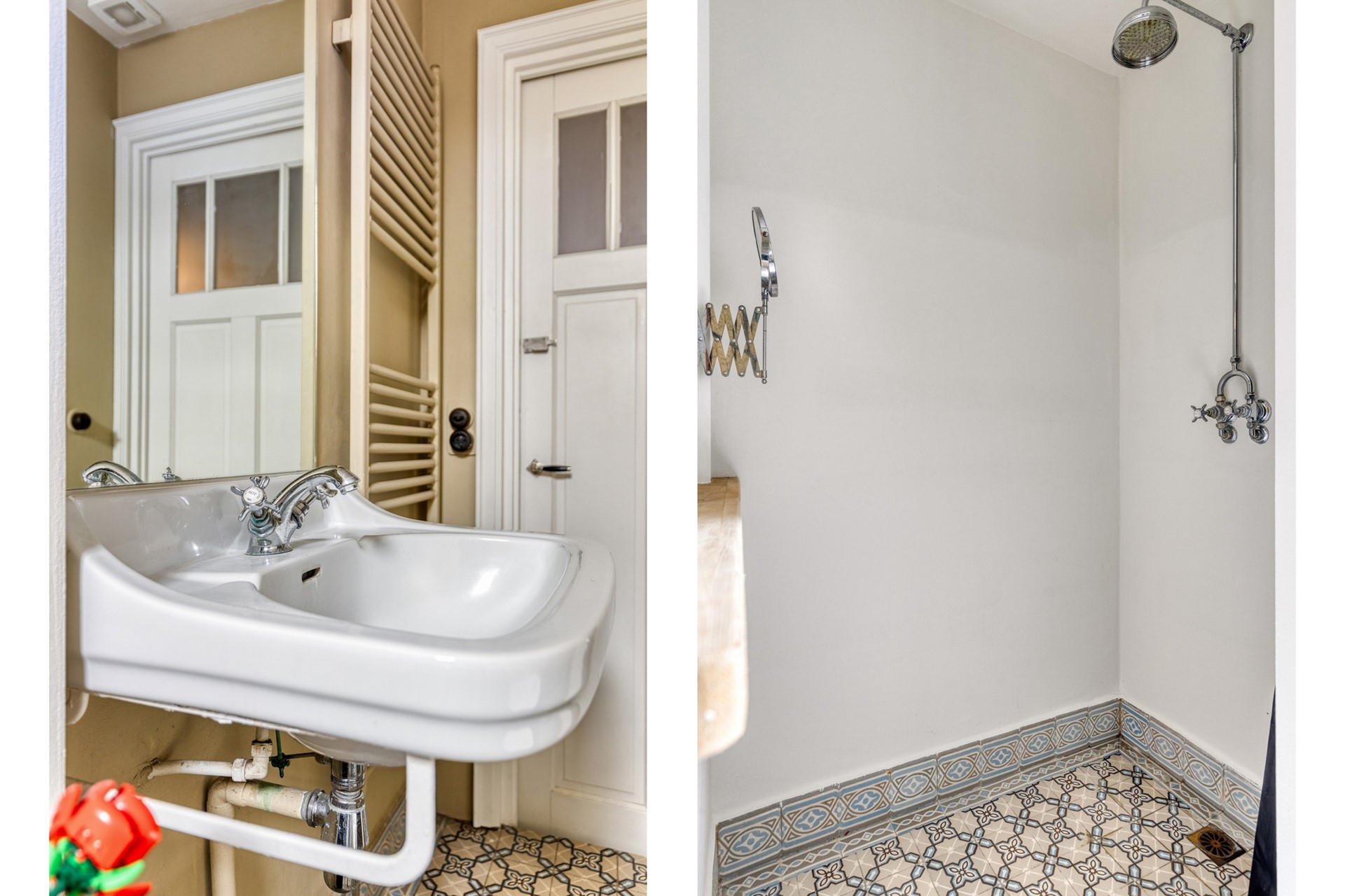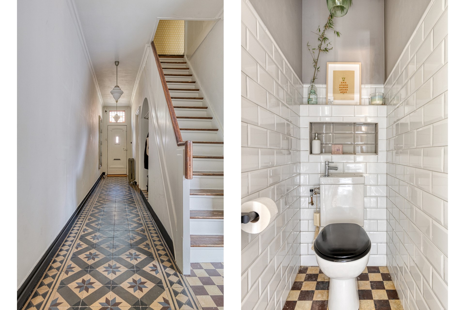 Via de karakteristieke voordeur kom je in een lange hal met gestucte wanden en een mooie authentieke tegelvloer die direct de sfeer van het huis weerspiegelt. Originele paneeldeuren, bakkelieten schakelaars en andere jaren ’20-details geven dit huis een uniek karakter.