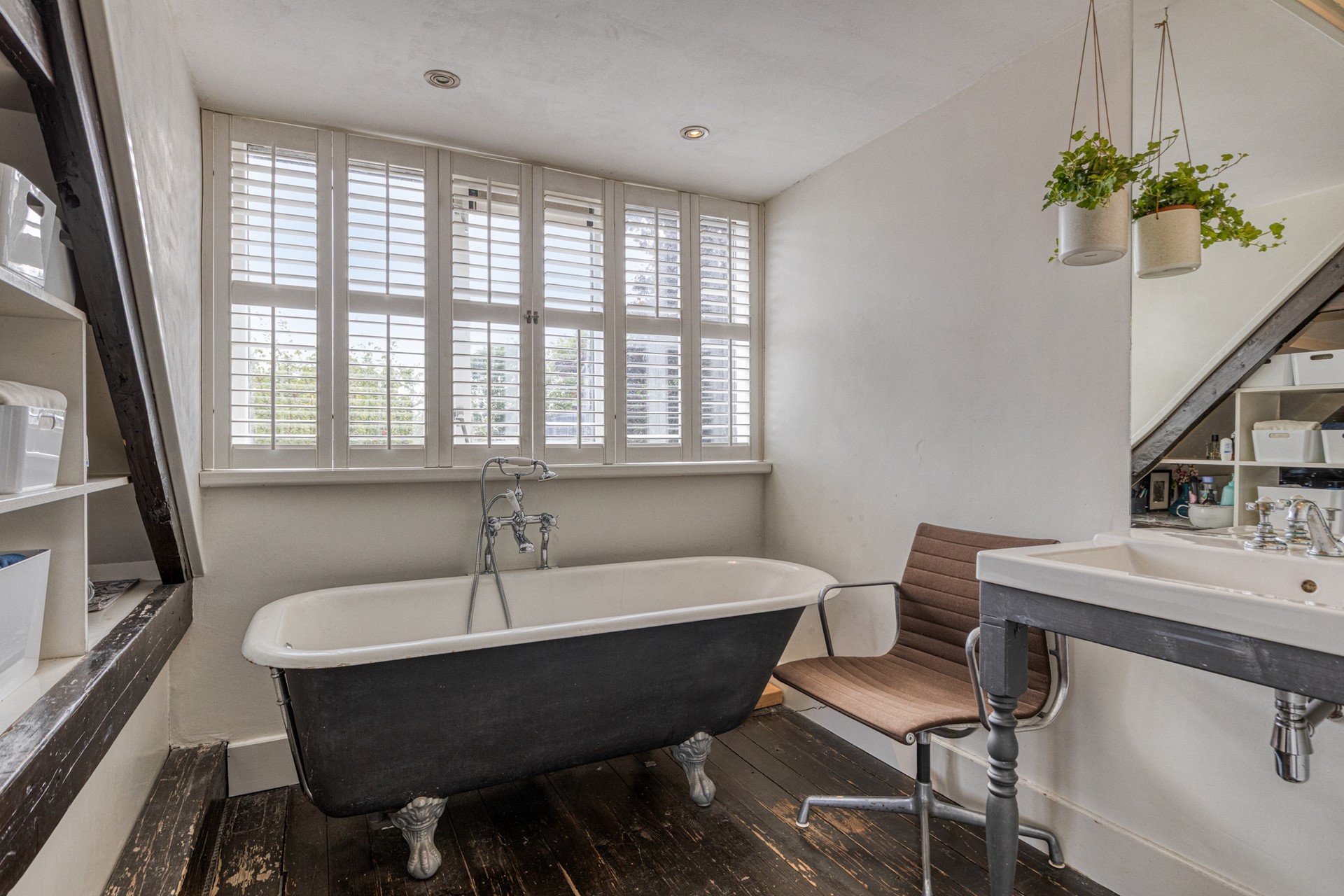Aan de achterzijde van het huis is de royale masterbedroom – een sfeervolle kamer met voldoende ruimte en een speelse indeling. Deze kamer is voorzien van een wastafelmeubel én een vrijstaand ligbad op pootjes; heerlijk om te ontspannen aan het begin of einde van de dag!