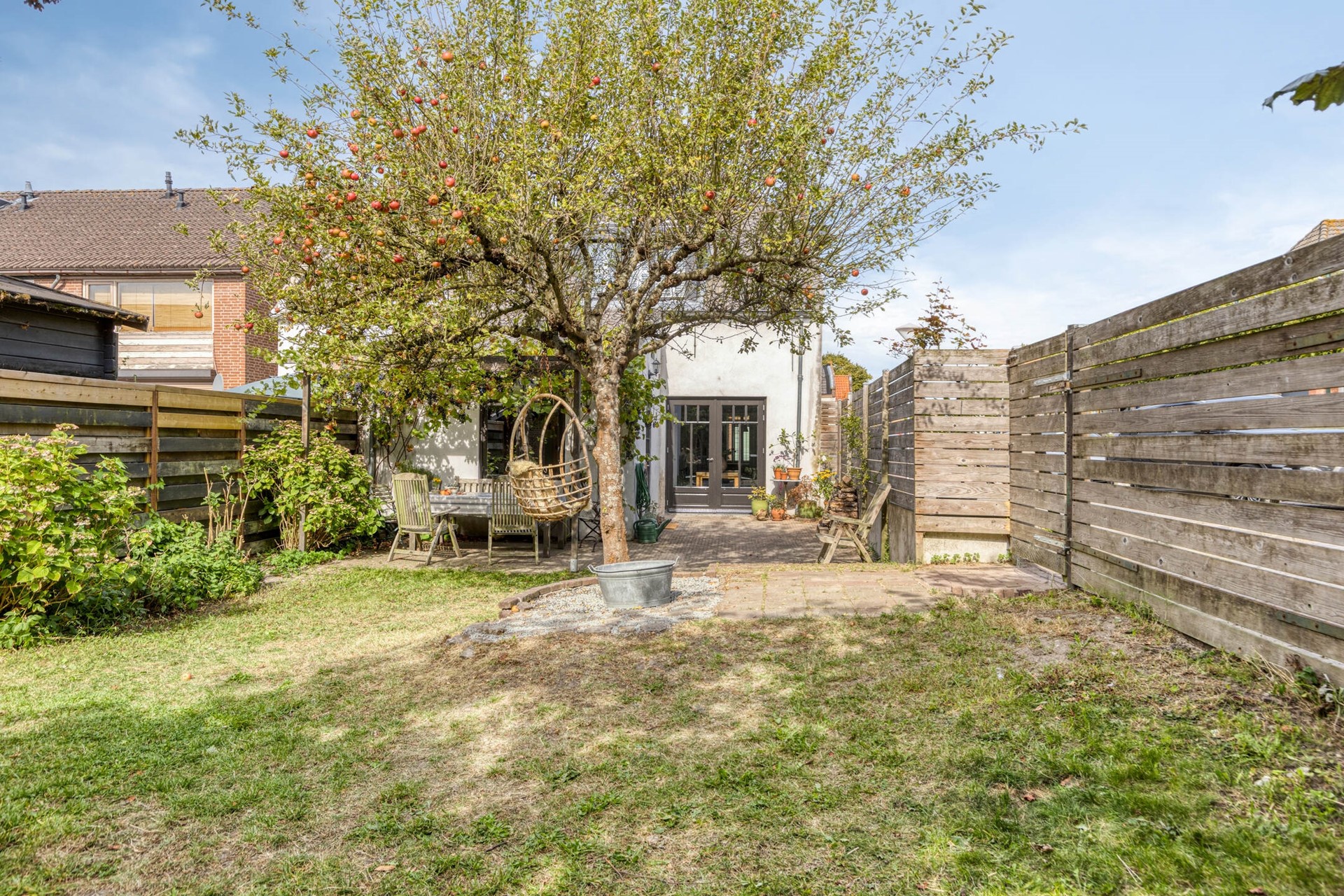Achter het huis is een heerlijk diepe achtertuin van maar liefst circa 40 meter, gelegen op het oosten. De tuin is ingericht met een groot gazon en diverse (fruit)bomen en biedt volop ruimte om te spelen, te tuinieren of gewoon te genieten van het buitenleven.