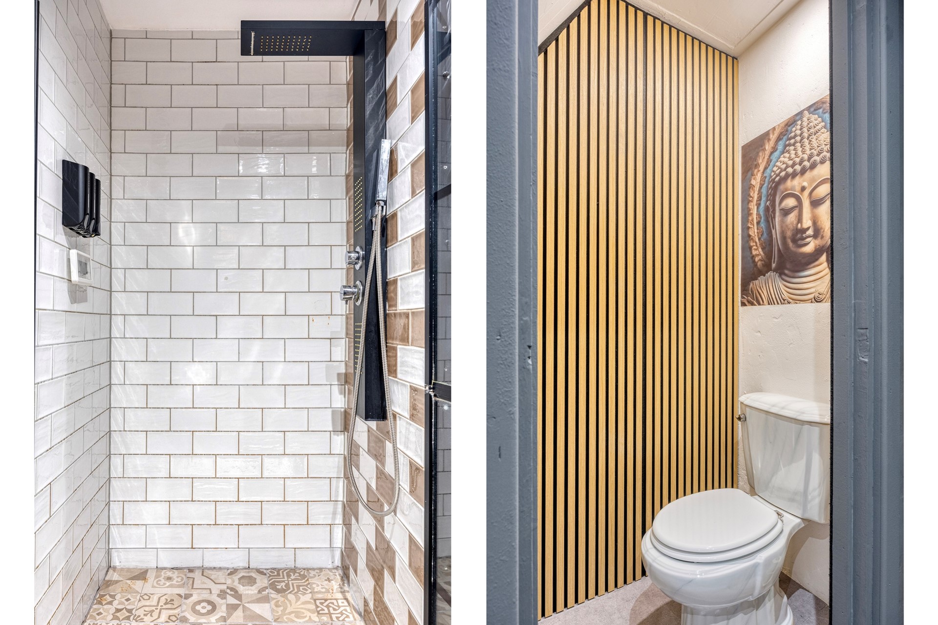 De badkamer is ingericht met een toilet, douche en wastafelmeubel.