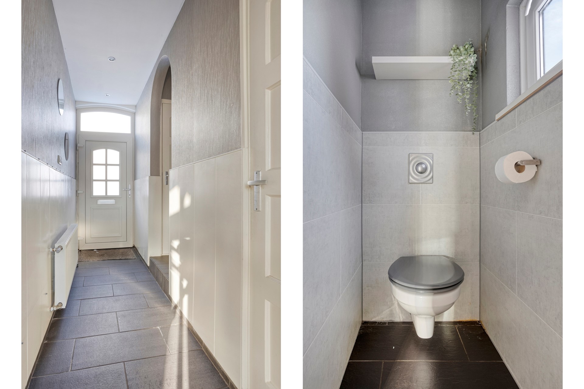 Entree in hal met trapkast waar ook de meterkast zich bevindt (12 groepen, 3 aardlekschakelaars). Het toilet bevindt zich een treetje hoger dan de hal en heeft een wandcloset. Via een mooie deur kom je in de woonkamer. Het eerste deel heeft een waskast met de aansluitingen voor de wasmachine en droger: handig als je je was buiten wil drogen. Via een boog kom je in de het tweede deel dat door de grote ramen heerlijk licht is. Een houtkachel zorgt voor extra sfeer en warmte.