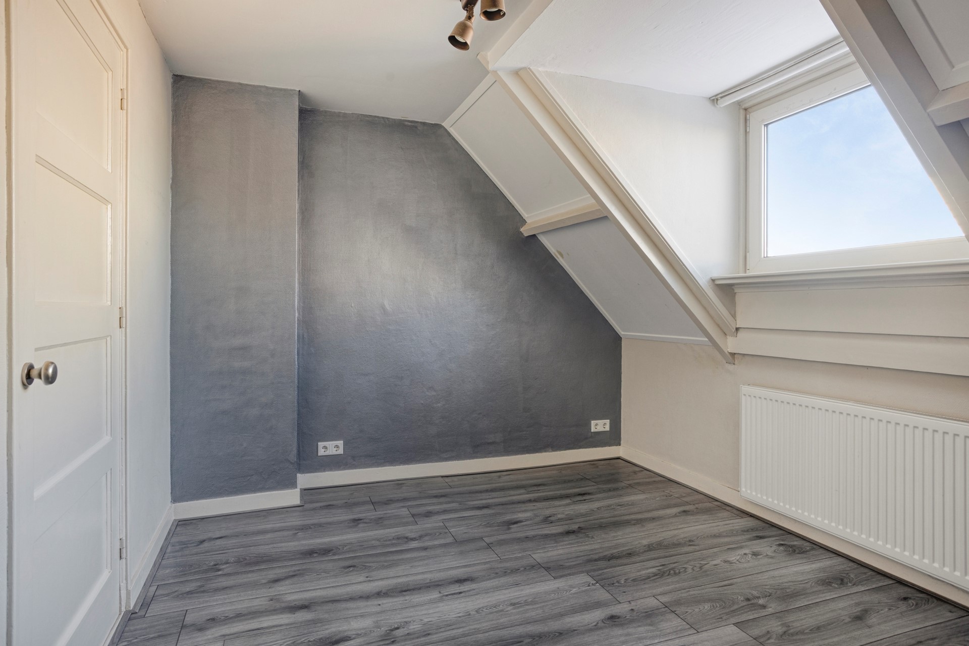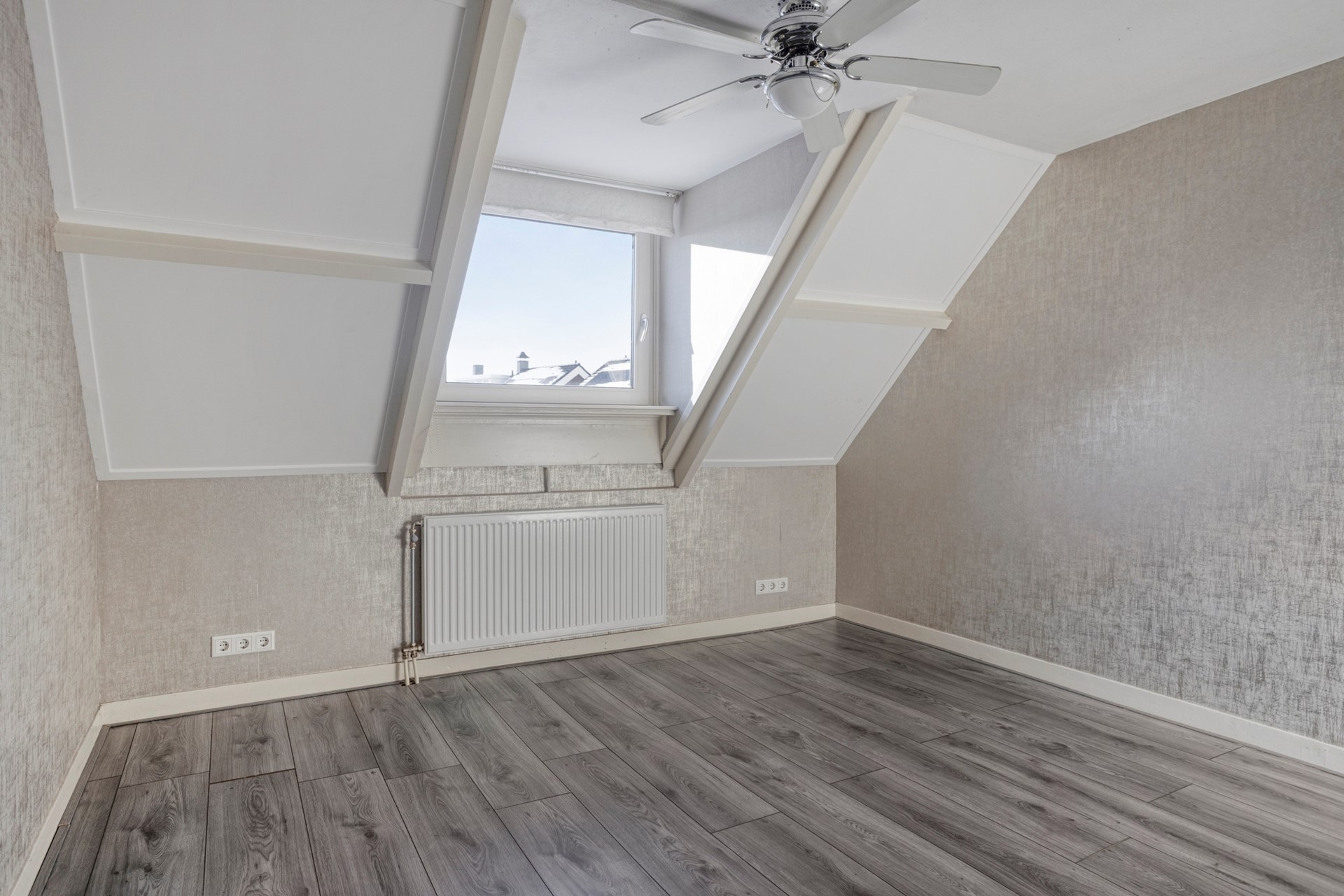 De tweede slaapkamer ligt aan de voorzijde van het huis. Ook deze heeft een dakkapel en een vaste kledingkast en is ongeveer 8,5 m².