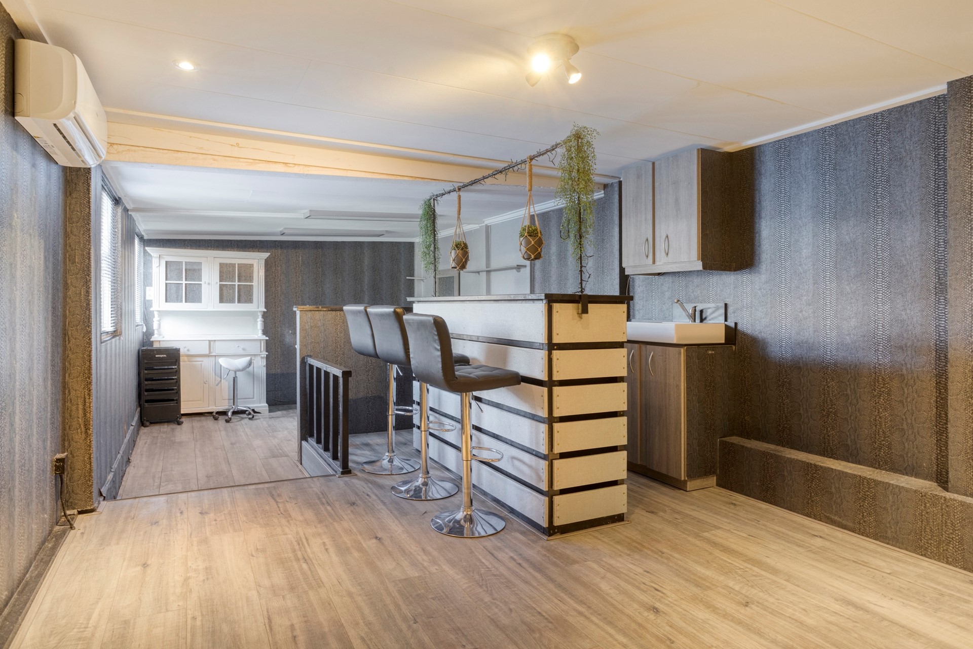 Het wordt verwarmd of gekoeld via een airco uit 2020. Qua inrichting vind je er een barretje met een wastafelmeubel en twee treetjes lager de ruimte om te knippen en haren te wassen. Ook is er een eigen toiletruimte met een staand toilet en een fonteintje. De ruimte is voorzien van dubbelglas en muurisolatie. Ga jij hier ook aan de slag om je eigen kapsalon te beginnen of heb je andere plannen met deze ruimte?