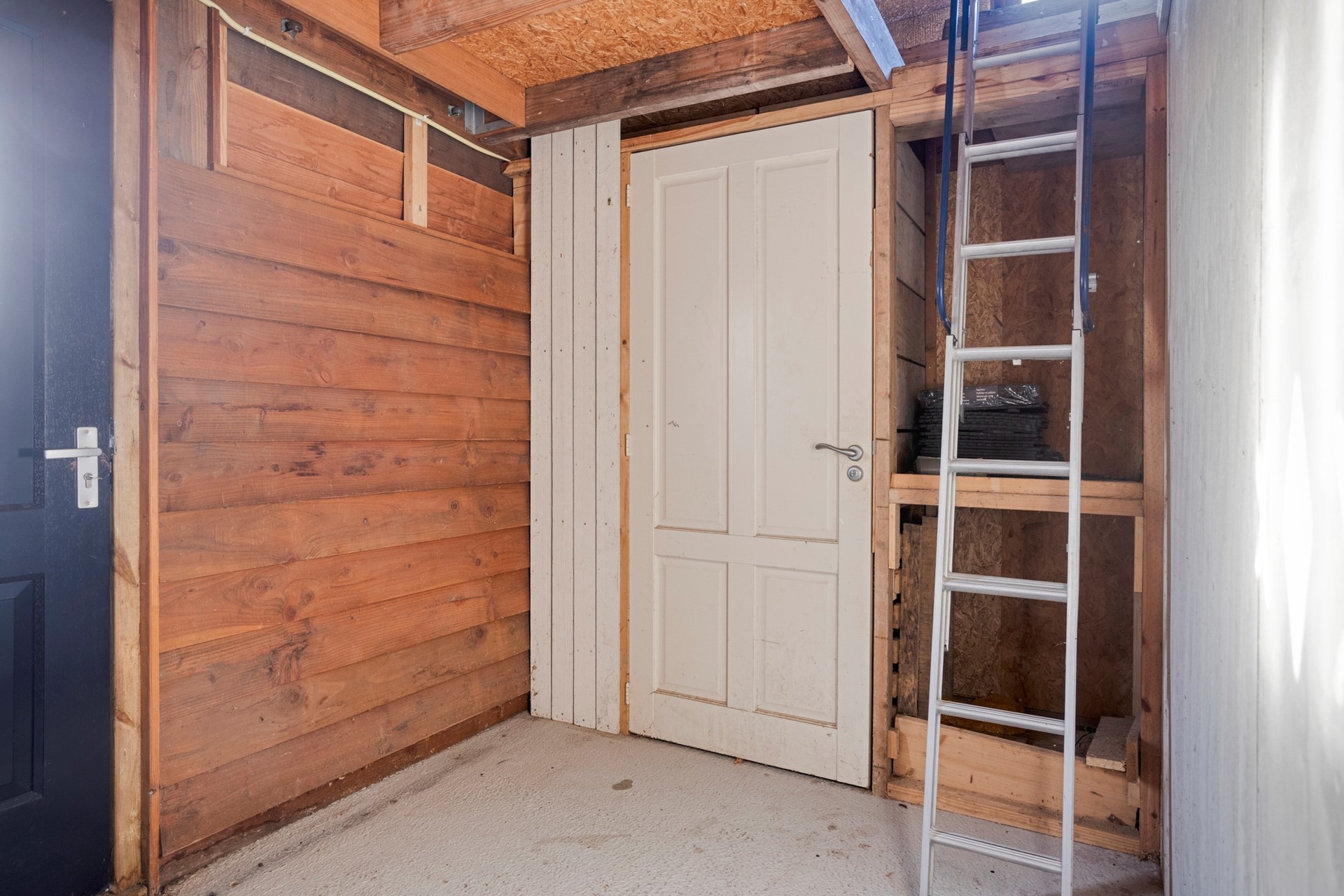 Achter in de tuin vind je het grote bijgebouw. Het eerste deel is een berging met betonvloer en houten wanden, die bestaat uit verschillende compartimenten en een bergzolder. In tweede deel is een kapsalon gecreëerd. Klanten hoeven niet via het huis, maar kunnen via de brandgang achter het huis de ruimte bereiken.