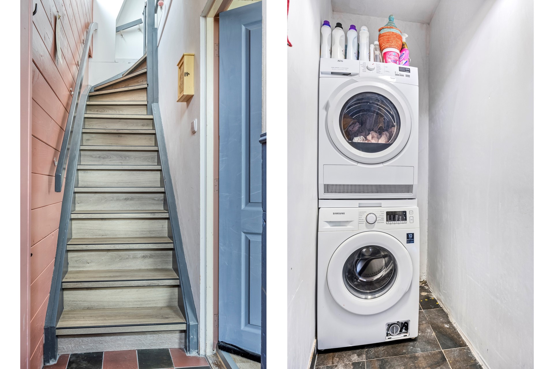 Vanuit de keuken is er ook toegang tot de was- en toiletruimte, met aan de linker kant het toilet en een fonteintje en aan de rechterkant de opstelplaats voor de wasmachine en de droger.