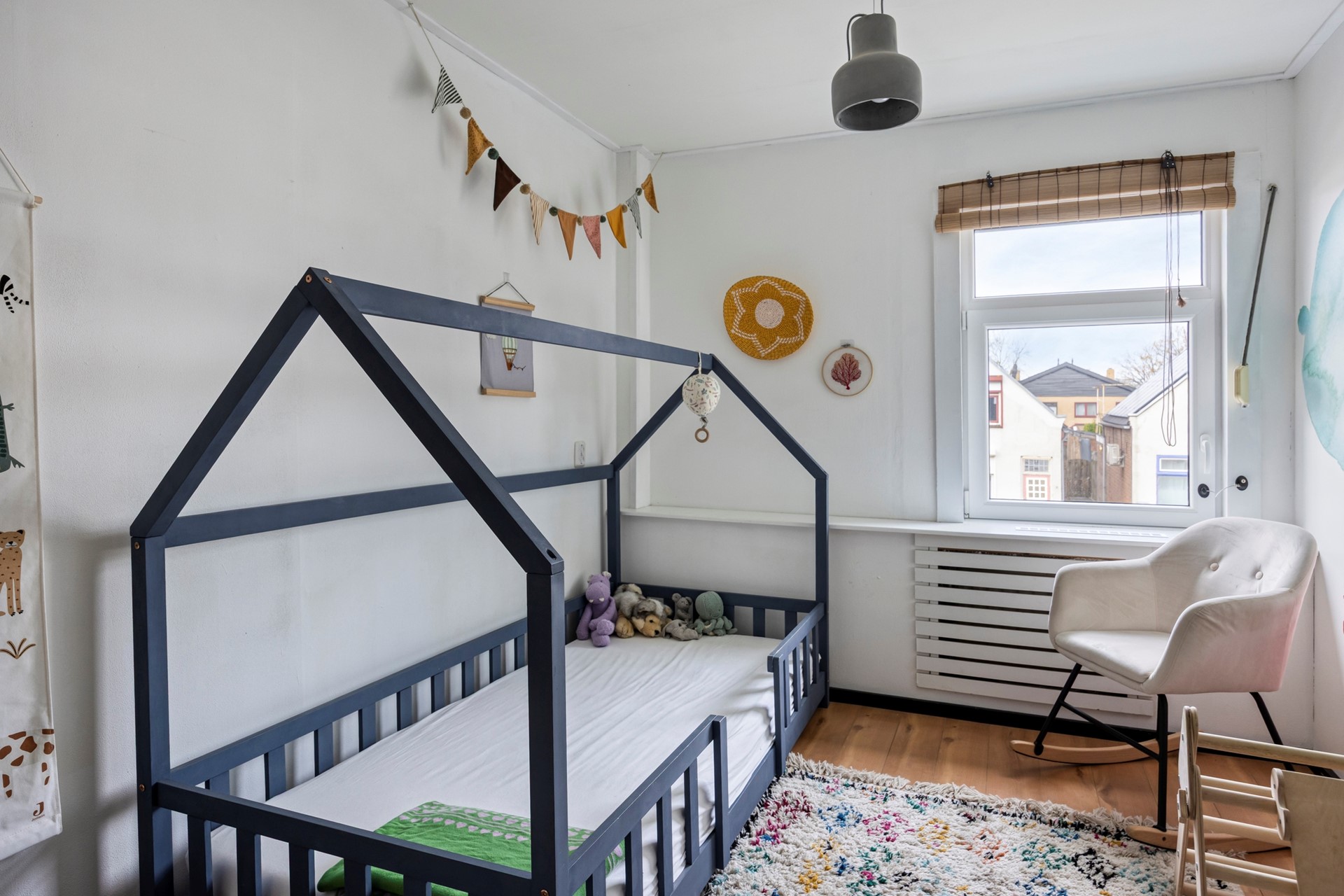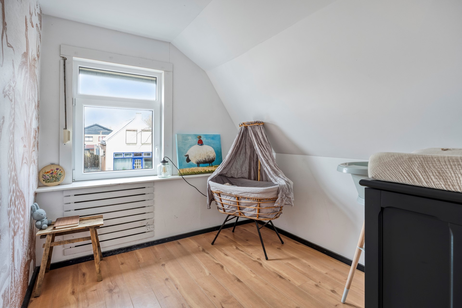 Aan de voorzijde van het huis zijn 2 slaapkamers. De kleinste is nu in gebruik als babykamer, maar is ook prima te gebruiken als 1-persoons slaapkamer, werk- of hobbykamer. De tweede slaapkamer is 4,19 bij 2,60 meter en dus ook mooi van formaat. Hier is eveneens het vlizo-luik met toegang tot de bergzolder.