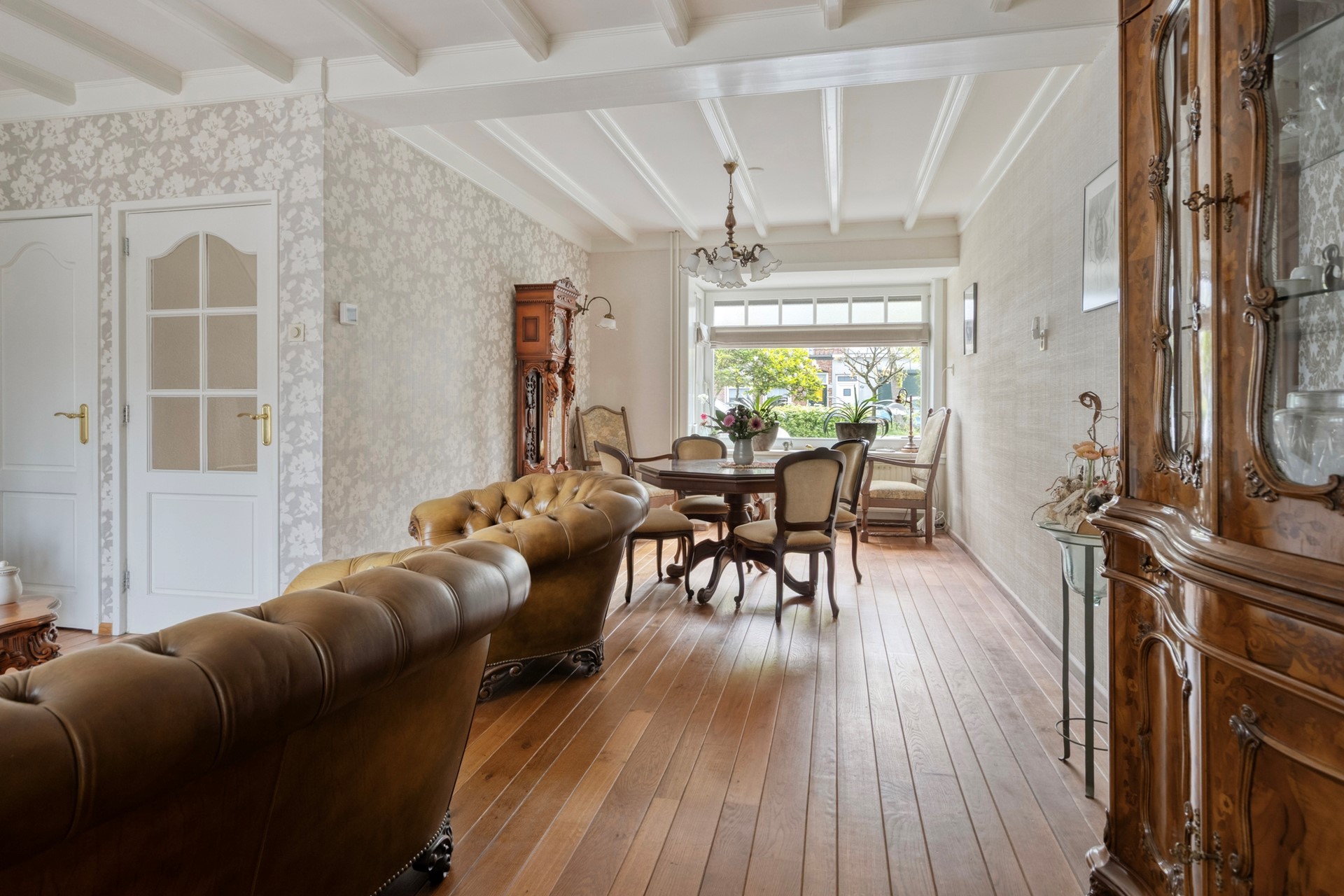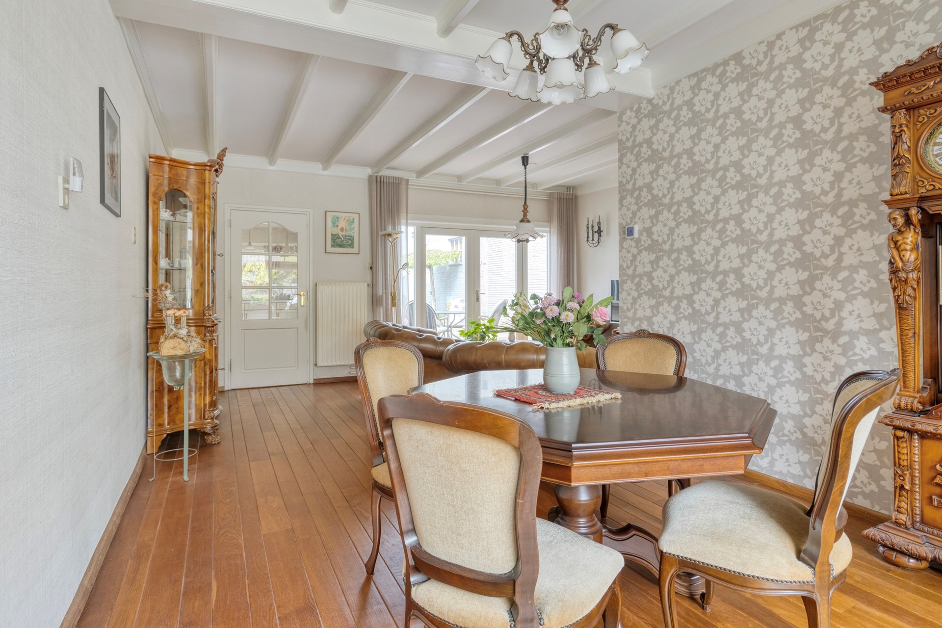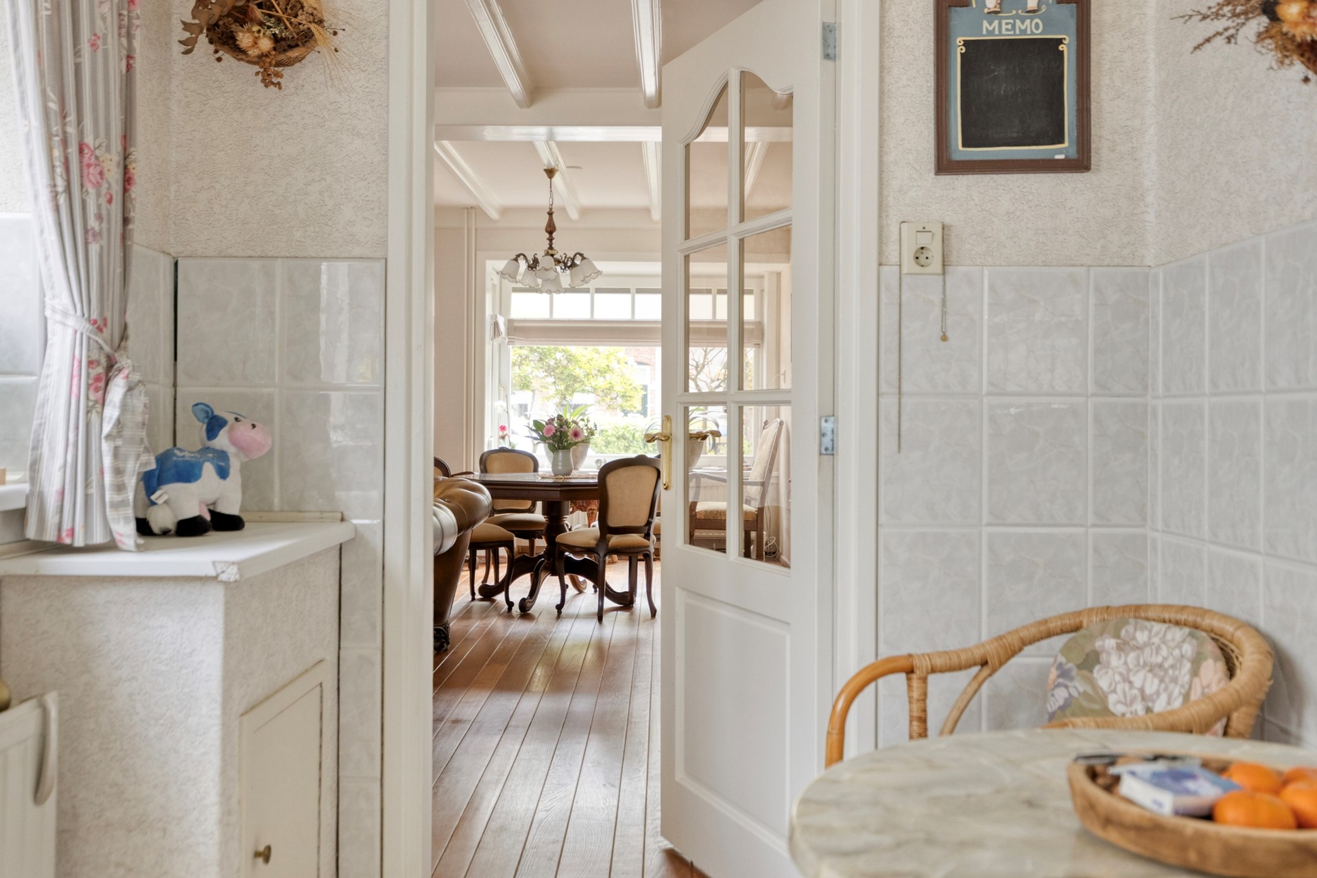 De woonkamer is een heerlijke, lichte leefruimte vol karakter. De houten parketvloer, het balkenplafond en de sfeervolle erker aan de voorzijde zorgen samen voor een warme uitstraling. De dubbele tuindeuren maken de verbinding met de tuin compleet en laten binnen en buiten op een mooie manier in elkaar overlopen. Dit is zo’n ruimte waar je je meteen thuis voelt.