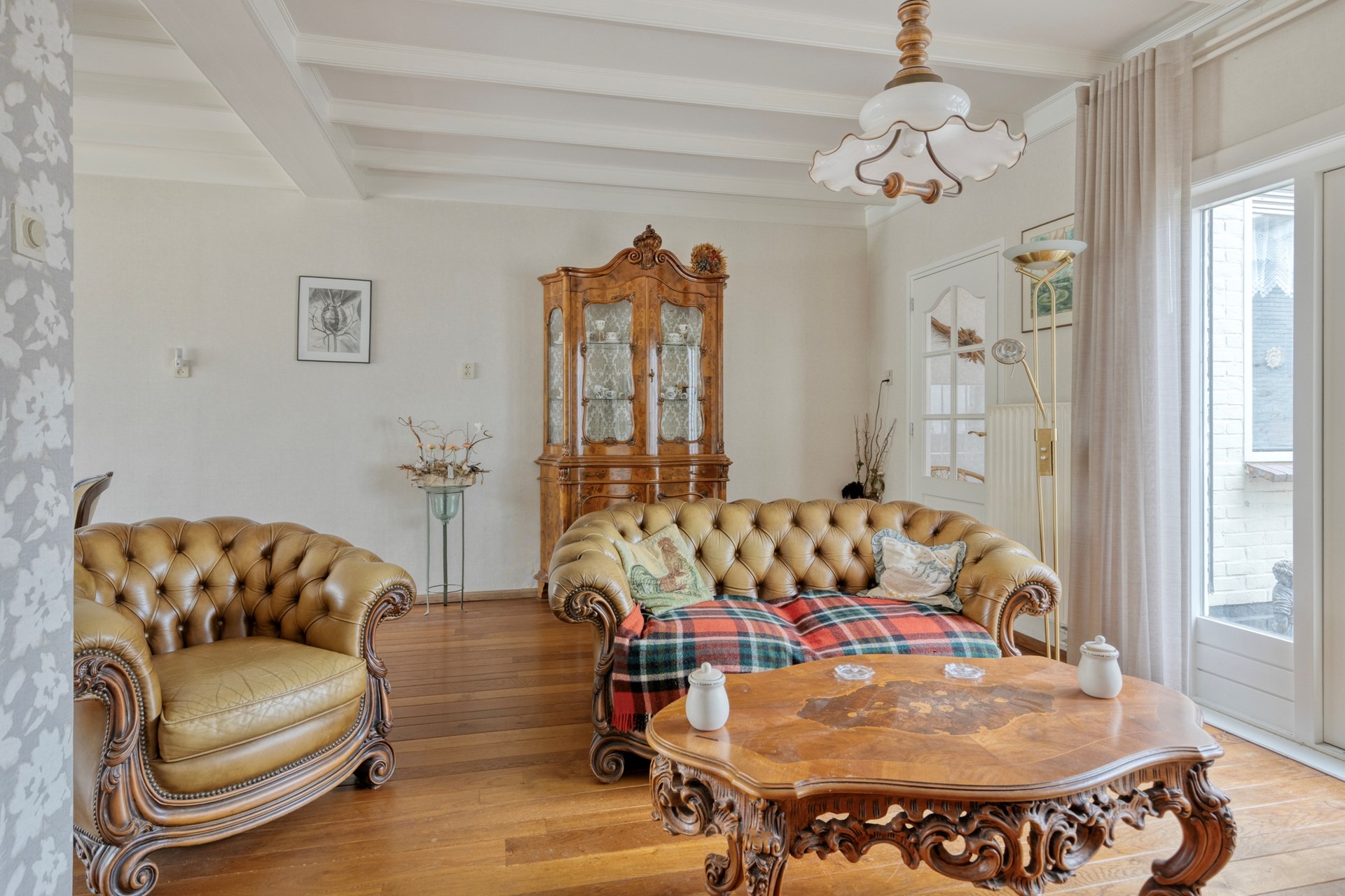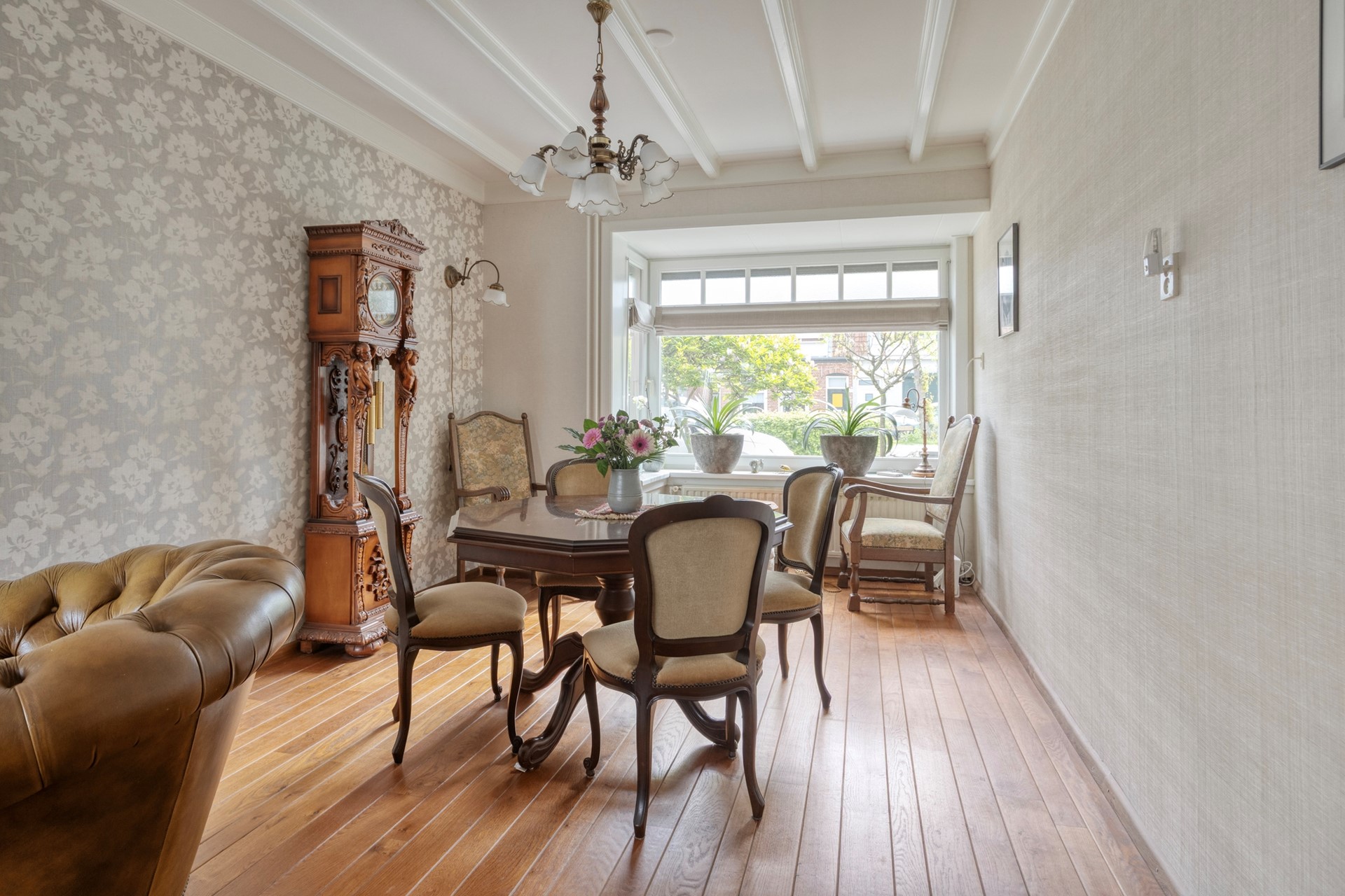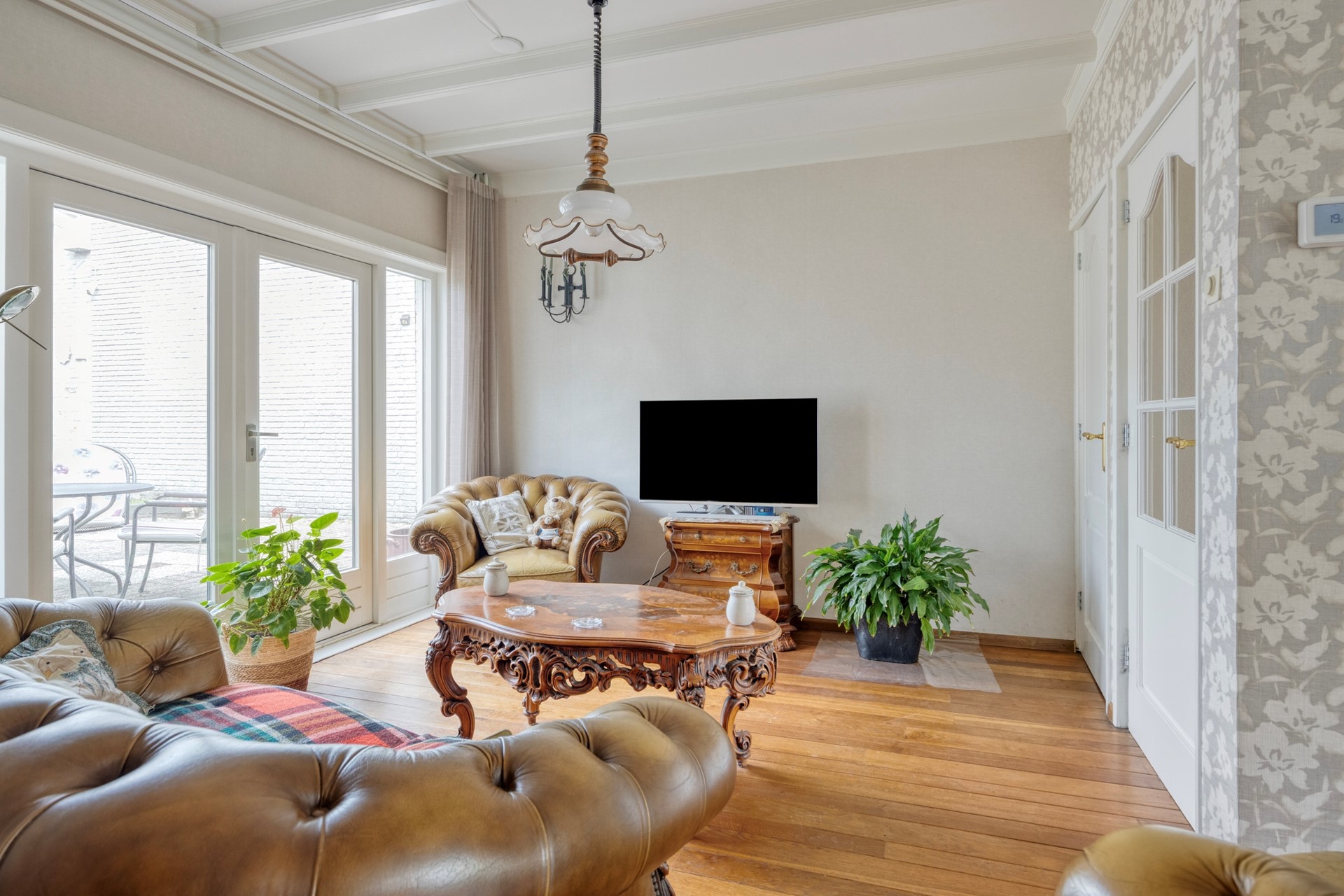 De woonkamer is een heerlijke, lichte leefruimte vol karakter. De houten parketvloer, het balkenplafond en de sfeervolle erker aan de voorzijde zorgen samen voor een warme uitstraling. De dubbele tuindeuren maken de verbinding met de tuin compleet en laten binnen en buiten op een mooie manier in elkaar overlopen. Dit is zo’n ruimte waar je je meteen thuis voelt.