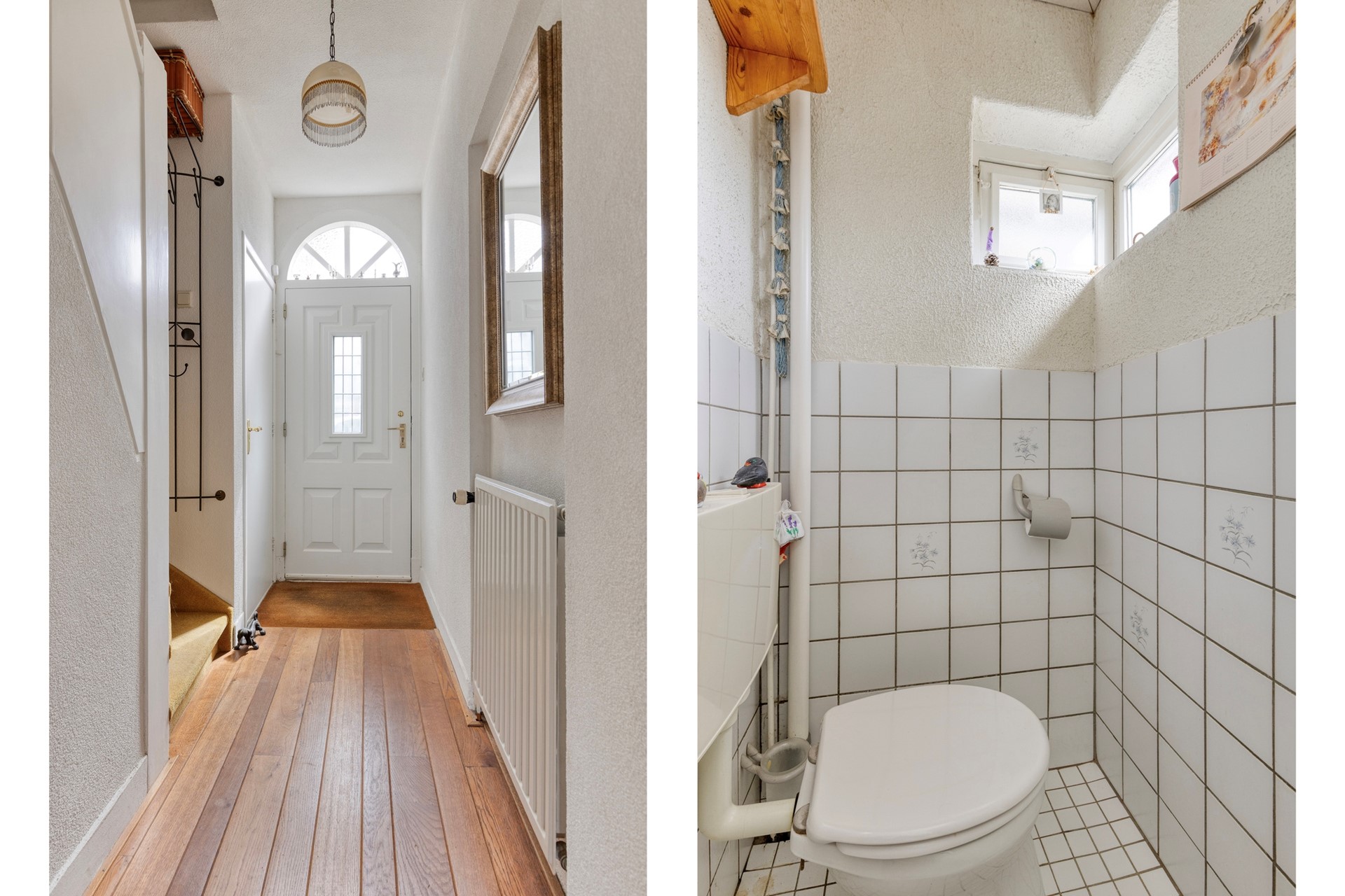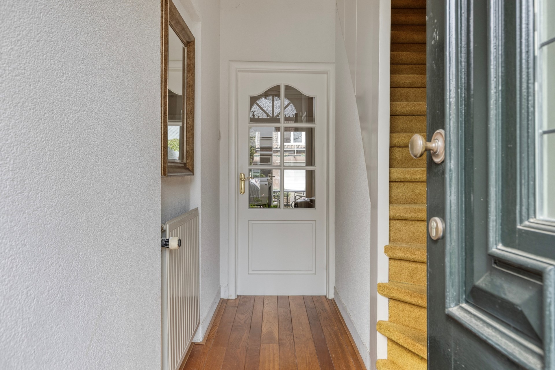 Je komt binnen in een lange hal die toegang biedt tot de woonkamer, de toiletruimte en de trap naar de eerste verdieping.