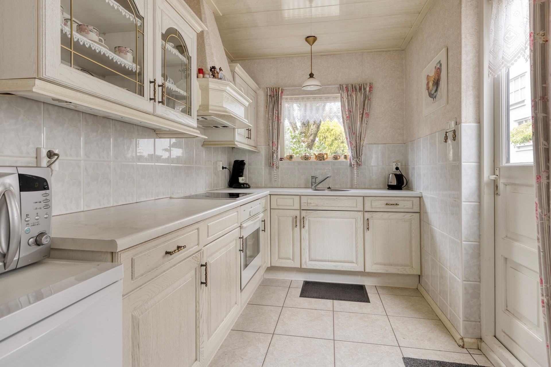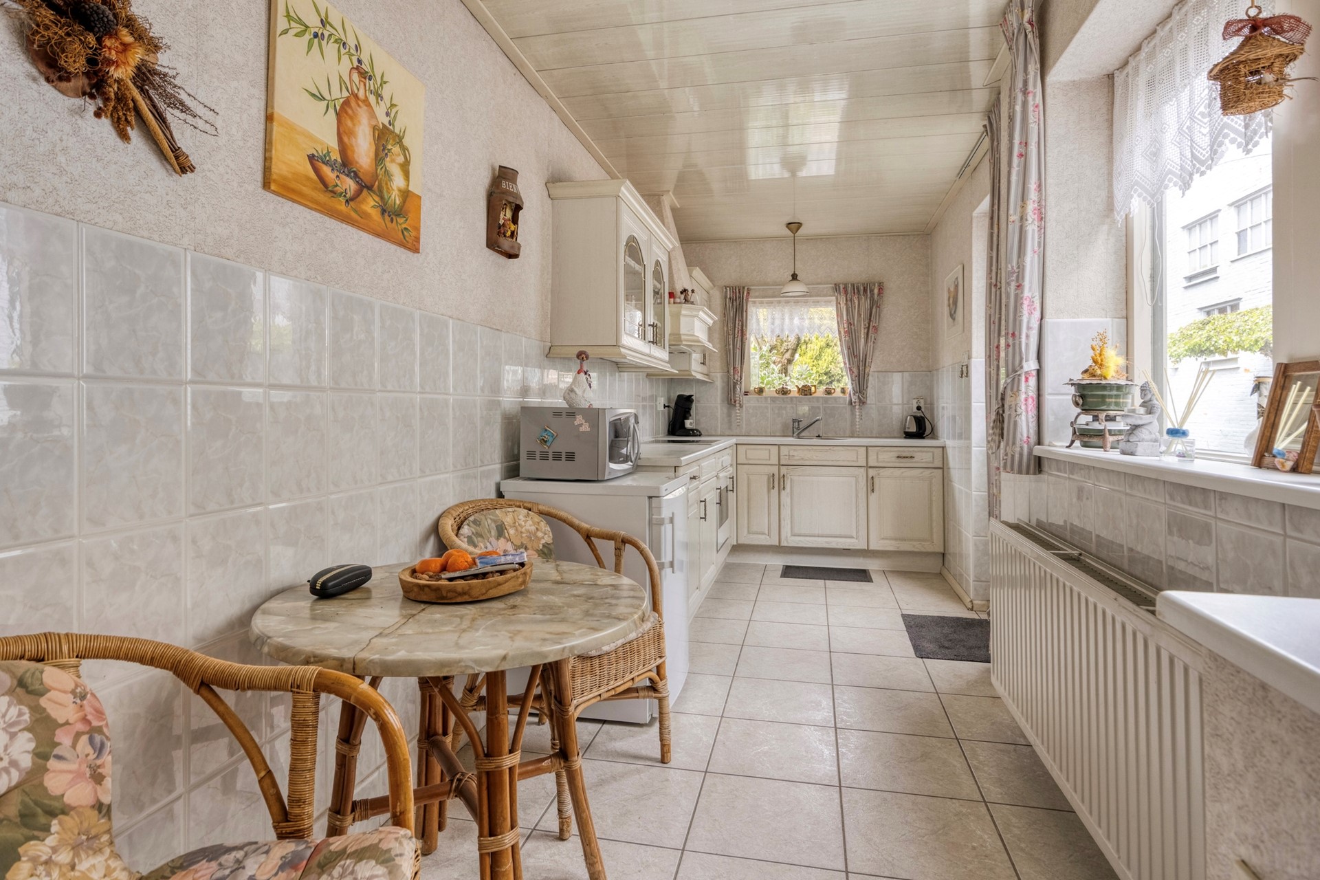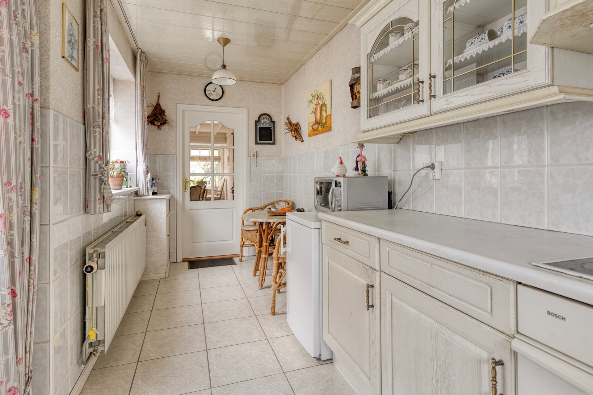 De keuken is netjes onderhouden en functioneel ingericht met een hoekopstelling, voorzien van een keramische kookplaat, oven en afzuigkap. Er is bovendien ruimte voor een kleine eettafel, waardoor het ook een gezellige plek is om de dag te beginnen. De keuken is netjes en functioneel en vraagt wat modernisering en dit biedt dus kansen om deze geheel naar eigen wens en stijl aan te pakken.