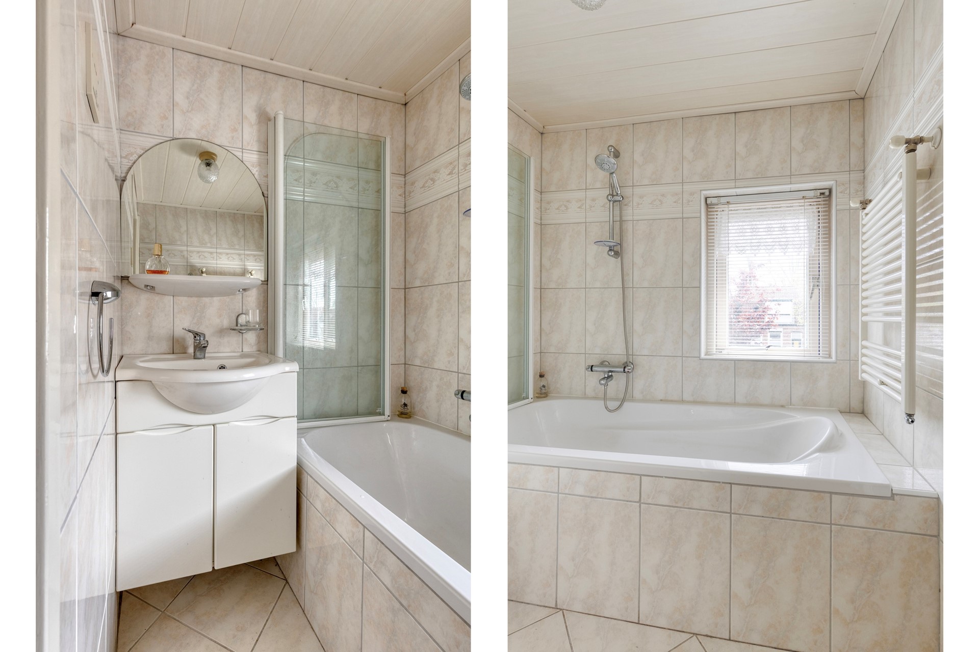 De badkamer is eenvoudig uitgevoerd en voorzien van een ligbad en een wastafel. Een functionele ruimte die desgewenst gemoderniseerd kan worden, zodat je ook hier je eigen stijl kunt toevoegen.