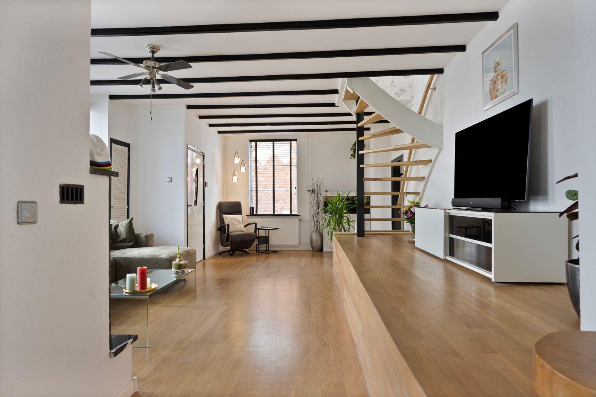 De woonkamer heeft een speelse verhoging/bordes; een uitnodigende plek om te zitten—bijvoorbeeld met een stapel kussens als gezellige loungehoek.