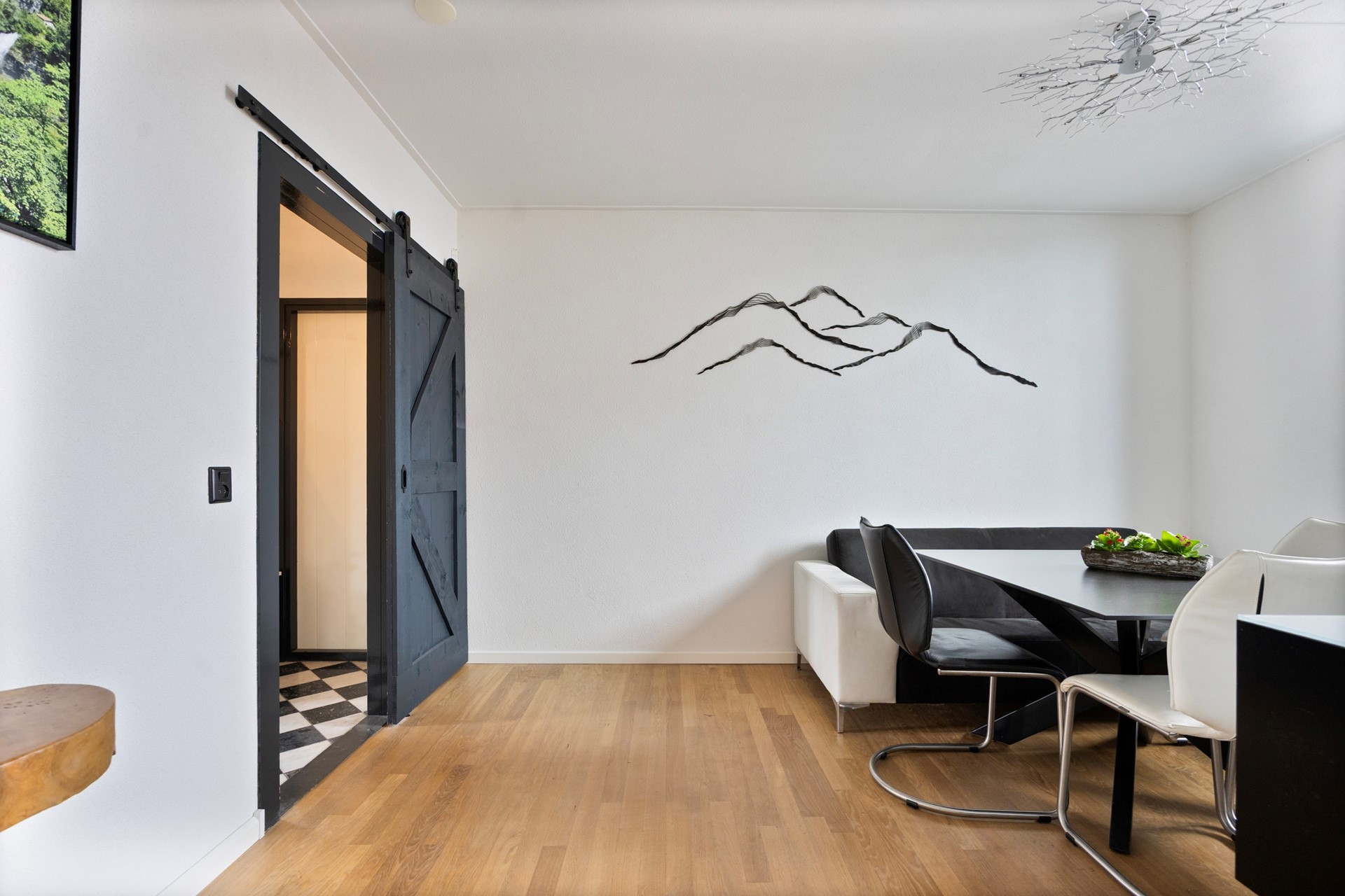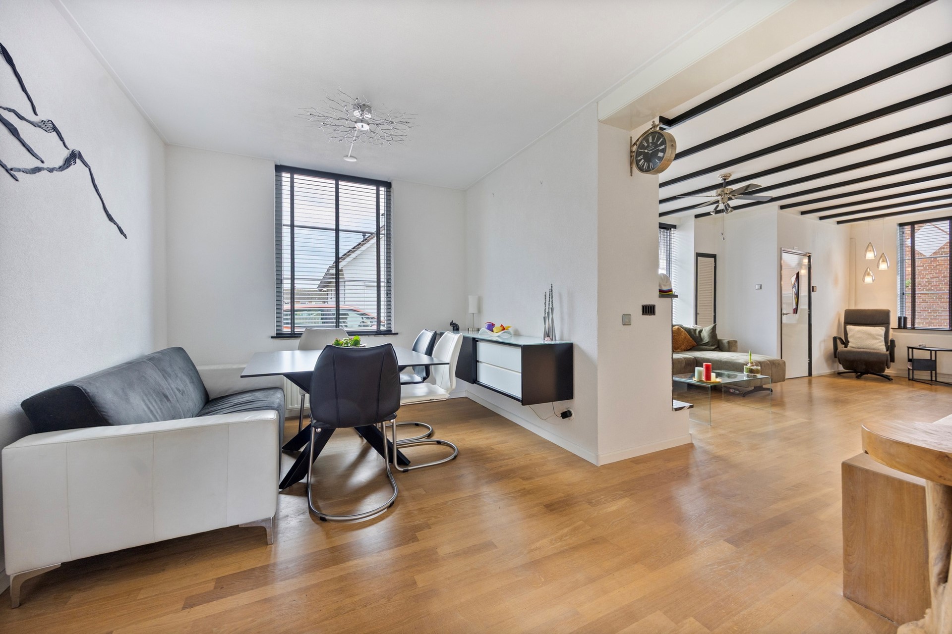 We stappen het huis binnen via de voordeur in een hal met ruimte voor de garderobe. Vanuit de hal, komen we in de woonkamer, waar de eikenhouten vloer meteen voor warmte en sfeer zorgt.