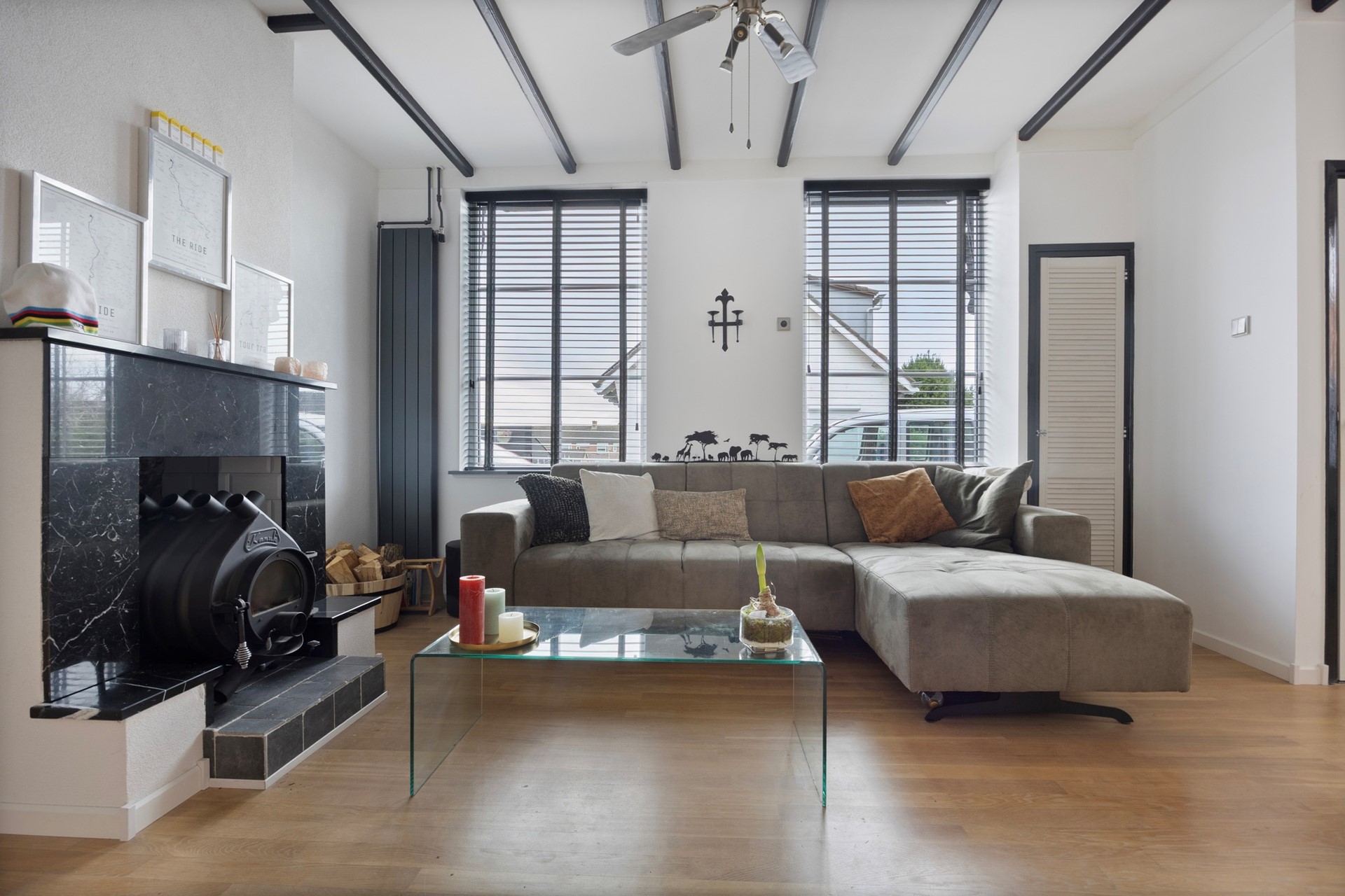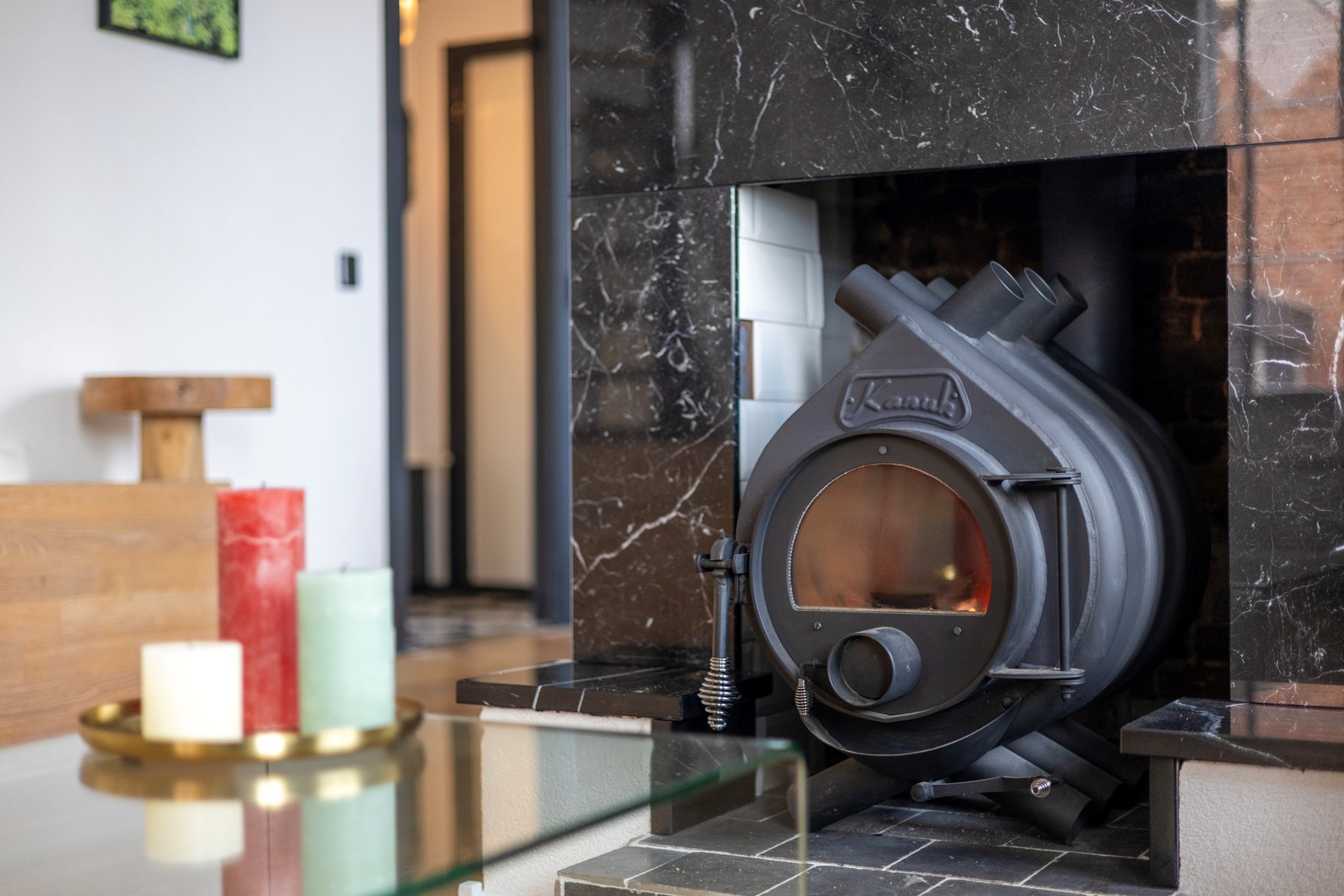 Een stoer extra element in deze ruimte is de Kanuk-houtkachel, die via ventilatie-uitgangen een heerlijke, gelijkmatige warmte door de kamer verspreidt.