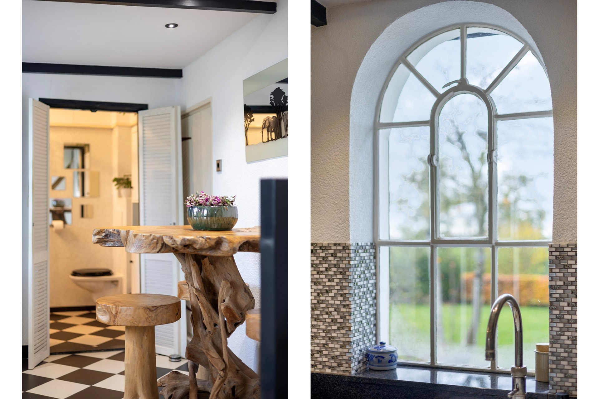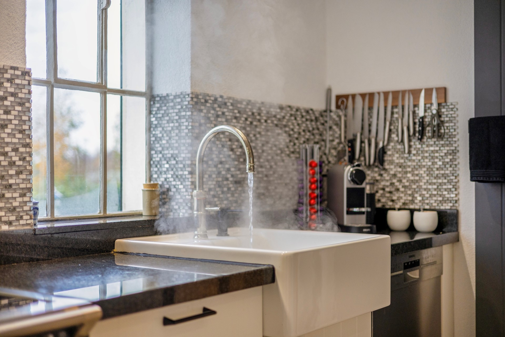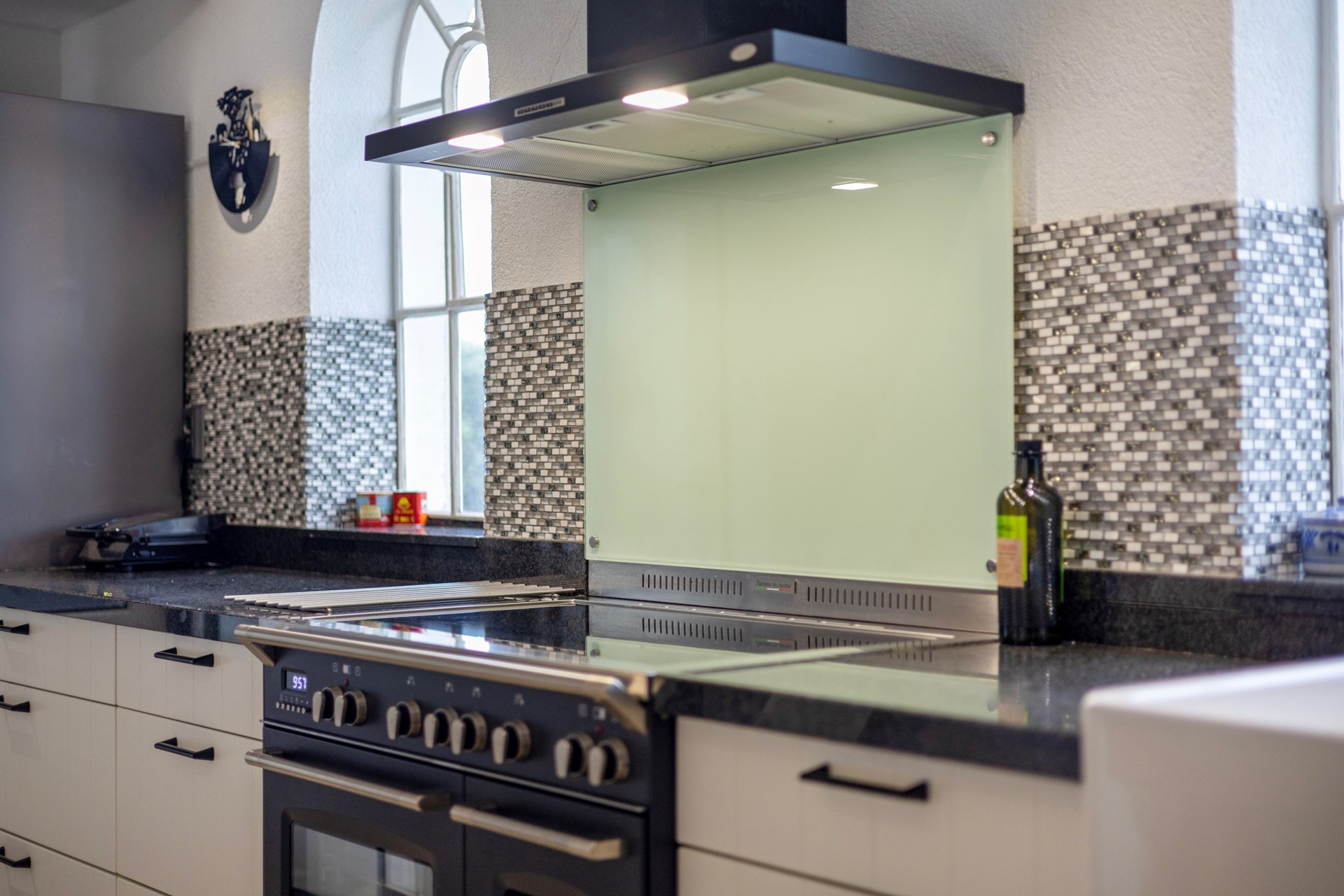 Vier treden lager is de keuken. De rechte keukenopstelling onder het raam biedt een mooi, weids uitzicht over de achtergelegen landerijen. De ruimte is uitgerust met een Boretti fornuis met grote en kleine oven, inductiekookplaat, bijpassende afzuigkap en een Quooker-kraan.