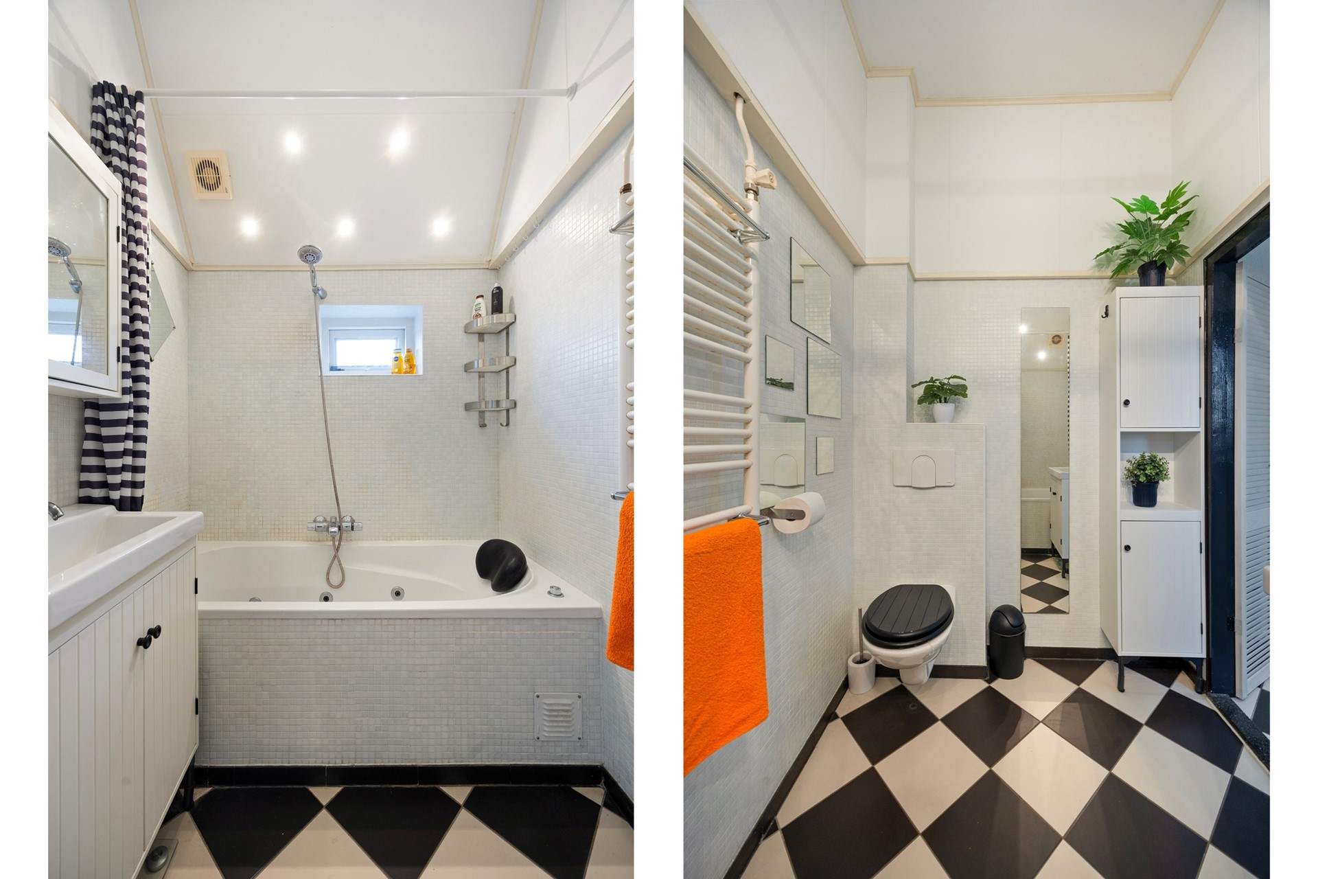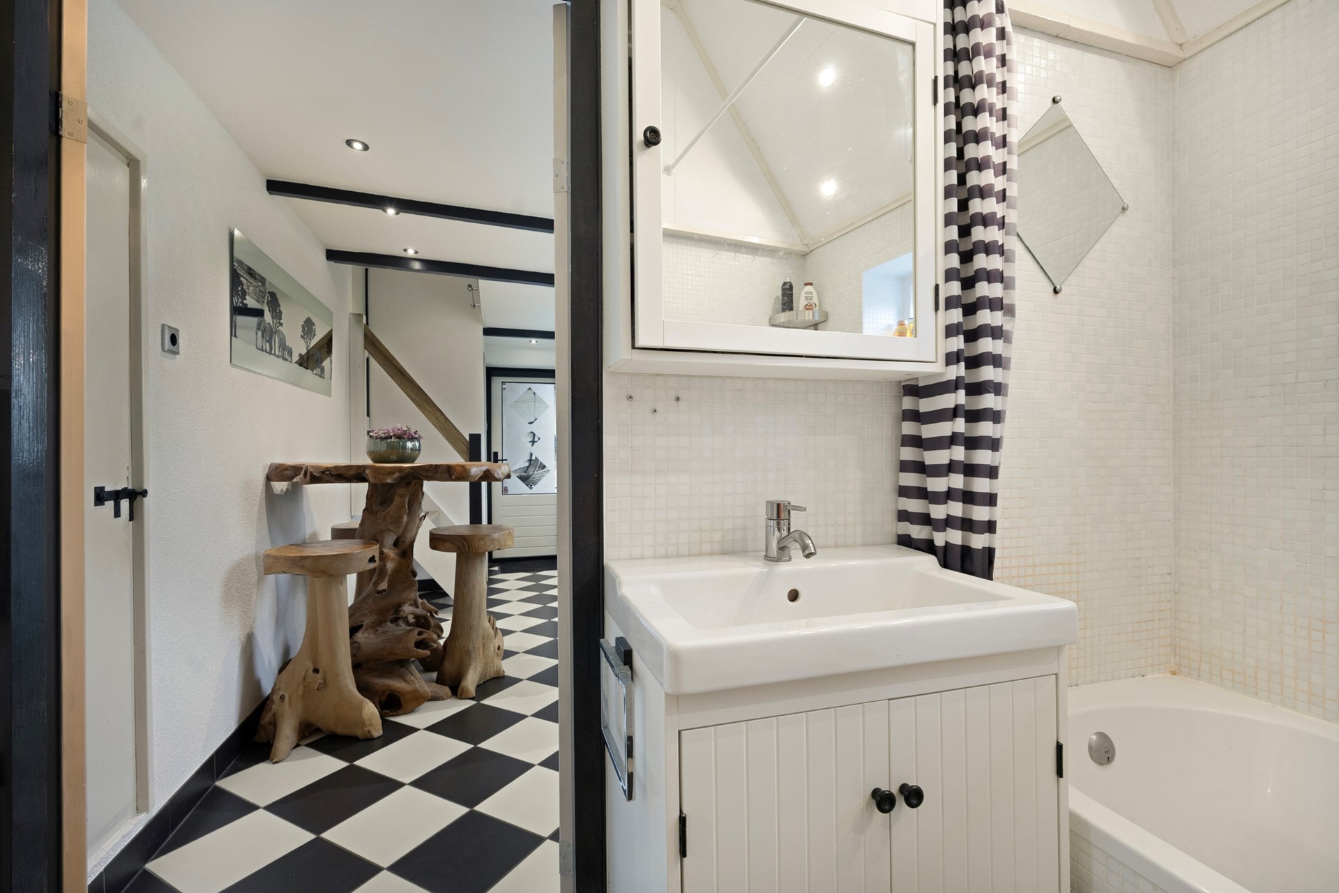 Naast de keuken is de badkamer, voorzien van een zwevend toilet, wastafelmeubel en ligbad. Dankzij de elektrische vloerverwarming is het hier altijd comfortabel. Vanuit de keuken is er ook toegang tot de overkapping en de tuin.