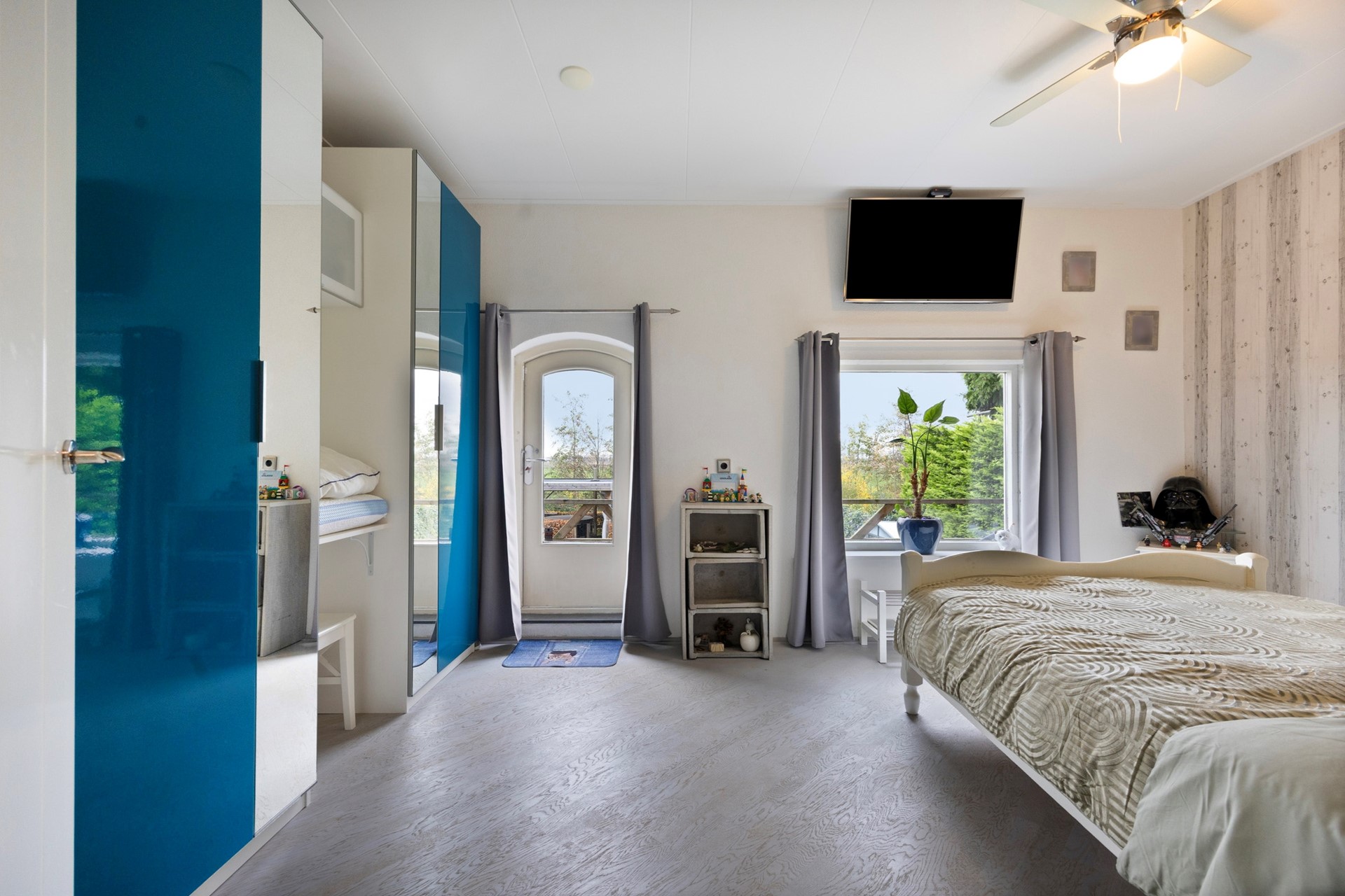 De slaapkamer biedt mooi uitzicht op de tuin — een heerlijke plek om wakker te worden en de dag te beginnen. Aan de kamer grenst een balkonnetje, dus als je wilt, kan je je dag lekker opstarten in de frisse buitenlucht.
