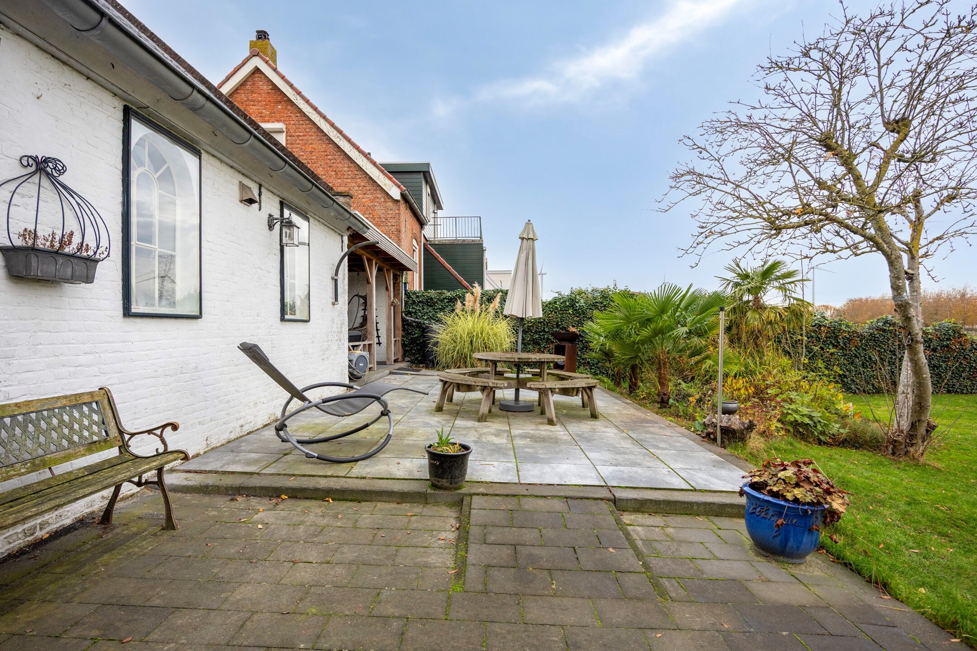 Verderop in de tuin is een verzorgd gazon, omzoomd door mooie beukhaagjes, kleurrijke borders en enkele kleine palmbomen, die een vleugje vakantiegevoel brengen. Een kleine vijver met fontein zorgt voor extra sfeer en een ontspannen geluid op de achtergrond. Overigens blijft de robot grasmaaier achter, dus dat scheelt weer een uurtje maaien per week!